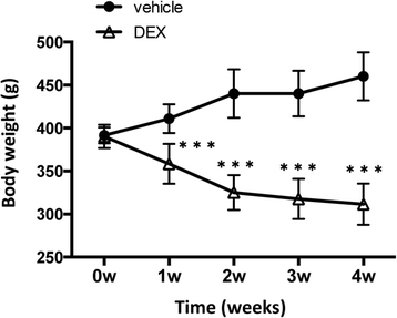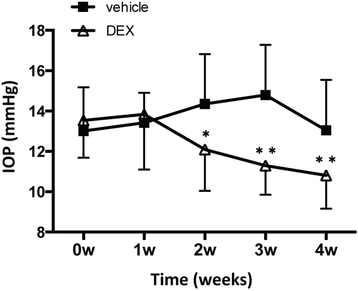 摘要:最近,地塞米松诱导的高眼压和随后的视网膜神经节细胞(RGCs)的丢失已经在小鼠中被描述。已被提议作为类固醇诱导青光眼的模型。在这项研究中,我们建立并评估了类似的大鼠模型。结果:采用十周龄SD大鼠(n=12)评价0.1%地塞米松(50ul)每日3次,连续4周。另一组大鼠(n=12)作为对照组使用氯化钠(0.9%)。1周后,我们观察到地塞米松给药的大鼠体重逐渐减少,与治疗前基线和赋形剂给药大鼠相比。与早期地塞米松滴注后眼压升高(IOP)相比,在给药后的眼睛中,大鼠的IOP意外下降到11.3±1.3毫米汞柱,与未经给药的眼睛相比,在地塞米松局部注射3周后,眼压降到了14.8±2.4毫米汞柱。治疗4周后的血液检查显示地塞米松治疗组大鼠血浆胆固醇(P<0.001)和丙氨酸转氨酶(P=0.019)比对照组增加3.3倍。同时,局部类固醇并没有引起血浆血糖或糖化血红蛋白(HbA1c)的变化。我们也没有检测到RGC标记(实时PCR)表达的变化。结论:与先前显示地塞米松局部给药后眼压升高的小鼠相比,在相似的治疗后,大鼠表现出矛盾的眼压降低,伴随体重下降,而不影响血糖水平。关键词:糖皮质激素 青光眼 眼内压 体重 背景:青光眼是视觉障碍的常见原因,影响全世界约7000万人。这种情况的特征是视网膜神经节细胞(RGCs)及其神经纤维的选择性丧失,导致视野逐渐缩小。高眼压(IOP)是青光眼的危险因素之一。因此,青光眼的有效治疗主要依赖于减少眼压的药物和/或手术。在类固醇作用的经典模型中,甾体分子与类固醇受体结合并调节各种基因的转录。糖皮质激素是一类甾体激素,具有抗炎作用,用于临床治疗自身免疫性疾病、过敏和眼内炎症,包括葡萄膜炎和视神经炎等疾病。另一方面,糖皮质激素治疗也有一些不良影响,如体重增加、血糖升高、甘油三酯和胆固醇升高以及血压升高。如果没有及时诊断和治疗,这种眼压升高最终会导致RGCS的丢失,并导致类固醇诱导青光眼的发展。这个问题并不少见,因为糖皮质激素的局部施用,例如地塞米松或倍他米松,可以提高大约30~40%的普通人群的眼压。然而,类固醇诱导青光眼的病理机制尚不清楚,因为还没有动物模型来模拟这种情况。最近建立了激素性青光眼伴高眼压和随后的RGCS丢失的模型,其中地塞米松局部治疗在C57BL/6J小鼠中使用了6周。该模型的详细分析显示内质网(ER)应激在其病理学中起着关键性的作用,这表明抑制ER应激是治疗激素性青光眼的一种有前途的方法。研究眼病的病理机制可以通过使用大鼠的一些优势。最明显的一点是,大鼠可以可靠地测量眼压。另一个优点是,一般而言,大鼠比小鼠更能容忍行为测试。因为在体内评估RGCS的功能是困难的。在这项研究中,我们尝试开发类固醇诱导的高眼压和青光眼大鼠模型。令人惊讶的是,我们发现局部类固醇给药降低大鼠的眼压,其结果与以前的小鼠发现相矛盾。方法:动物:十周龄雄性SD大鼠。地塞米松局部治疗:地塞米松21磷酸二钠溶于生理盐水中,制成0.1%溶液。氯化钠(0.9%;生理盐水)作为赋形剂。地塞米松或赋形剂局部应用于大鼠右眼(50μL/眼)(n=12,每组)每天3次。所用类固醇的量是基于先前对小鼠进行的工作来计算的。计划使用眼药水6周改变为4周后意外减少眼压。对大鼠的左眼不予治疗。眼压与体重的测量:大鼠用异氟烷麻醉,通过在角膜中心应用回弹眼压计在上午9点和下午2点之间测量眼压。IOP测量后立即测量体重。这个过程每周重复一次。外周血生化分析:用氯胺酮(500 mg/kg)和甲苯噻嗪(45 mg/kg)的混合物给大鼠深度麻醉。然后在打开胸腔后从心脏轻轻抽取血液样本。将血液样品离心,收集上清液,然后将其进行生化分析。在含有氟化钠的收集管中收集少量的全血,以测量糖化血红蛋白(HbA1c)。蛋白质印迹法:眼球前段被摘除,并从大鼠眼睛中解剖和切除后段(包含视网膜、巩膜和脉络膜)和晶状体,并准备SDS-PAGE,如前面所述。将每车道十微克蛋白质加载到10%聚丙烯酰胺凝胶上,然后电泳和蛋白质的大小分离。然后将蛋白转移到PVDF膜,如前所述。将每车道十微克蛋白质加载到10%聚丙烯酰胺凝胶上,然后电泳和分离蛋白质。将蛋白转移到PVDF膜。将兔抗CHOP抗体或兔抗ATF4抗体作为一抗在4℃孵育过夜。. TWEN PBS洗涤后,HRP偶联山羊抗兔抗体在室温下作为二抗孵育1小时。结果:局部地塞米松对大鼠眼压及体重的影响:本研究的目的是通过应用类似于提高小鼠眼压升高的方案建立类固醇诱导性青光眼大鼠模型。因此,我们最初计划将剂量调整的地塞米松滴眼剂每日灌输3次,为期6周,如小鼠协议中所述。然而,用0.1%地塞米松局部眼治疗1周后,我们发现地塞米松治疗组大鼠体重显著下降。激素治疗后大鼠体重在随后的几周内持续下降,治疗后4周降至生理盐水组的66.6%。更令人惊讶的是,我们观察到,伴随着体重下降在治疗2周后开始降低眼压。3周后激素治疗组的眼压明显低于对照组。此外,未经处理的对侧左眼的眼压在大鼠局部地塞米松治疗后也降低,这导致我们推测DEX处理的大鼠的眼压降低是由于全身性的影响,而不是对眼睛特定的影响。类固醇灌注4周后获得相似的结果。在这一点上,我们决定停止研究,因为很明显,大鼠的反应与小鼠非常不同,并且完成最初计划的6周治疗不会使我们接近建立大鼠高眼压模型和类固醇诱导青光眼的目标。局部应用地塞米松可提高血浆胆固醇和丙氨酸转氨酶而不影响血糖:为了更好地