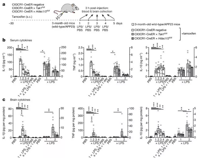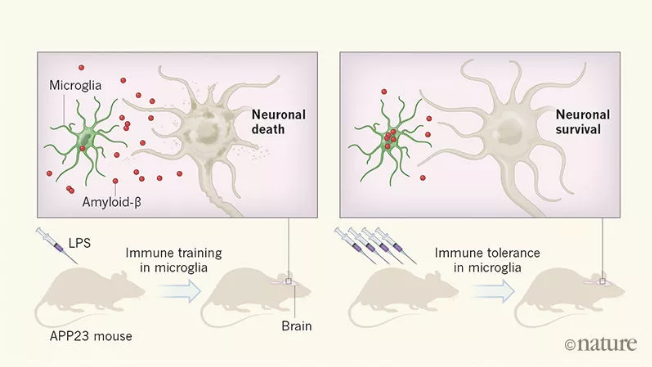 免疫刺激唤起小神经胶质细胞的免疫记忆。Wendeln et al.先天免疫系统可以保留长达数月的感染“记忆”,从而改变之后的免疫应答。免疫记忆存在两种形式:一是训练,通过训练增强抵抗再感染的免疫应答;二是耐受,持续的暴露会抑制免疫应答。虽然已知体内炎症可以激发脑部免疫应答,但是免疫记忆是否发生在大脑固有免疫细胞——小神经胶质细胞内仍不为人知。调控小神经胶质细胞应答的可能性引起了人们的广泛兴趣,因为这些细胞关乎阿兹海默病和中风等疾病。此外,它们极其长寿,因此即使不是永久性的,持久性的修饰或许是有可能的。