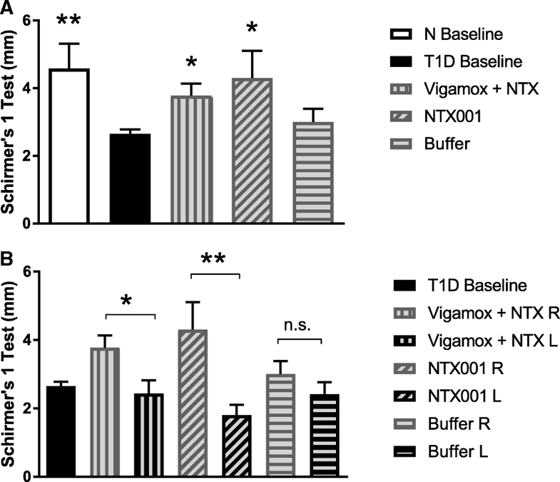 背景:干眼症(DED)是糖尿病的常见并发症,表现为泪液分泌减少和/或角膜表面敏感度增加,常伴有继发性眼表改变。本研究检验了一种新型滴眼液的安全性和有效性,该滴眼液是一种用于局部治疗DED的新型滴眼液。方法:使用雄性SD大鼠建立1型糖尿病(T1D)大鼠模型,研究20μg/ml纳曲酮(NTX)的疗效和安全性。用Schirmer's 1试验测量泪液生成量,用感觉计测量眼表灵敏度。糖尿病大鼠在一只眼睛上滴一滴(约0.02 ml)NTX-001或赋形剂每天两次。为了进行比较,一些糖尿病大鼠使用含有NTX的无菌vigamox?滴眼液。正常的雄性大鼠和雄性兔每天接受两次滴剂治疗,持续30天,通过评估眼部组织病理学来监测其安全性。结果:单次NTX-001治疗后数小时内,T1D大鼠的干眼发生逆转。在10天的时间内,NTX-001恢复了角膜敏感性,同接受赋形剂的糖尿病大鼠相比,逆转了干眼。与溶于VigaMox?中的NTX相比,专利NTX-001在逆转干眼方面更有效。对正常大鼠和兔进行的安全性研究表明,30天的治疗后没有明显的眼部病理变化。结论:一种含有20μg/ml NTX的新型研究性滴眼液能有效地逆转糖尿病动物的泪膜缺损并恢复角膜表面的敏感性,而不产生毒副作用。关键词:干眼症 泪液生成 角膜表面敏感度 纳曲酮背景:泪液不足性干眼病(TDDE)或水性干眼病(DED)是指与病理生理学和/或环境因素有关的泪液分泌异常。它是一种多因素疾病,以泪膜体积变化和眼部不适为特征,可能具有炎症成分。如果不治疗,严重的DED可能导致疼痛、角膜溃疡和潜在的视力丧失。即使是更温和的DED也可能导致慢性不适和视力模糊。由于女性、老年和自身免疫性疾病(特别是1型或2型糖尿病)而增加了患病风险。大多数治疗都是非处方(OTC)或处方润滑剂(人工泪液、凝胶、软膏),其成功取决于频繁使用。许多治疗只提供暂时缓解,大多数不针对潜在的疾病病理学。具有炎性病因的TDDE的常用处方治疗方法是含有环孢菌素活性成分的restasis(rx)和Lifitegrost(xiidra),后者是2016年FDA批准的淋巴细胞功能相关抗原-1拮抗剂。这两种疗法都是针对炎症引起的干眼症的外用药物。Restasis?的功效有限,需要长时间使用(例如,4周)才能生效。与OTC人工泪液、凝胶、凝胶插入物和软膏相比,可以提供暂时缓解、类固醇加载的泪点塞或通过及时咬合的外科治疗来维持慢性干眼症患者泪液潴留的基本水平。因此,迫切需要新的局部处方治疗。临床前研究报告,阿片类生长因子(ogf)–ogf受体(ogfr)调节途径在逆转或改善糖尿病的几种眼部相关并发症中发挥作用。对正常动物角膜伤口再上皮化的广泛研究证实了OGF在细胞内稳态中的整体作用。NTX阻断ogf-ogfr相互作用的额外研究显示糖尿病小鼠和大鼠角膜伤口愈合加速。临床前报告表明,局部应用溶于Vigamox的NTX可逆转干眼症,并在单滴眼液数小时内恢复1型和2型糖尿病动物模型的泪液生成和眼敏感度。方法:NTX-001 1型糖尿病干眼症疗效研究动物和1型糖尿病的诱导(T1d):雄性SD大鼠,体重约160g。选择雄性大鼠进行本实验,以保持与先前发表的糖尿病并发症NTX治疗研究的一致性。连续两天腹腔注射40 mg/kg链脲佐菌素(ph 4.5),使动物血糖升高。血糖水平>250 mg/dl表示高血糖和1型糖尿病(T1d)。非糖尿病大鼠被视为正常对照组,注射无菌生理盐水。动物在血糖升高5周后使用。T1d大鼠的入选标准为:(i)与非糖尿病雄性大鼠相比,体重至少下降10%,(i i)血糖水平>250 mg/dl,以及(i i i)正常大鼠的基线Schirmer值低于平均Schirmer评分的70%。治疗:将t1d大鼠随机分为治疗组,每天两次(~ 08:30和~ 16:00),仅对右眼滴眼液(~ 0.02 ml/滴眼液)(i)20μg/ml NTX(NTX-001),(i i)缓冲液/赋形剂,或(i i i)5×10?5 M NTX溶于Vigamox中。对照组包括:(i)T1d大鼠左眼未经处理;(i i)仅接受赋形剂的T1d大鼠右眼或左眼;以及(i i i)正常动物的右眼或左眼。每天治疗持续10天,在第一次注射STZ后8周内完成。泪液体积的测量:使用Schirmer条测量泪液体积。使用无菌的单刃刀片将标准Schirmer条带预切至1 mm×17 mm长,并按照公布的程序进行测量。将条带插入1 min。使用校准单位为毫米的细尺测量每条条带的湿润长度,精确到半毫米。治疗(2-4 h)后,收集用NTX-001、赋形剂或Vigamox?治疗的T1d大鼠的Schirmer 1测试分数。在96 h和7 d对经NTX-001或缓冲剂治疗的大鼠进行额外测量。停止治疗后,每天测量大鼠的泪液量,以确定干眼何时恢复。角膜表面灵敏度的测定:角膜敏感度采用耳蜗帽式感觉计测量。对每只动物进行四次测量,并取平均值;终点为眨眼反应。数值(g/mm2)直接从制造商的换算表中确定。在接受赋形剂或NTX-001治疗的T1d大鼠和正常动物治疗后48小时和240小时(10天)测量角膜表面敏感性。眼内压:在研究结束时,测量糖尿病大鼠治疗组的眼压(IOP)。简言之,未经麻醉的大鼠测量眼压。平均眼压是从每只眼睛4个读数中获得的。NTX-001对正常大鼠和兔的安全性研究:大鼠安全性研究:10只雄性SD大鼠(126-150g)。治疗方案在7天后开始,包括每只大鼠每天接受4滴(每滴0.02 ml)专有的NTX-001制剂(20μg/ml),在8:30给右眼2滴,在16:30 给2滴药。每天治疗两次,持续30天,动物安乐死(>150 mg/kg戊巴比妥钠)后,眼睛用戴维森改良的固定剂支撑和固定。组织技术人员用石蜡包埋眼睛(瞳孔视向),切片并用苏木精和伊红染色;玻片以隐蔽的方式贴上标签,由兽医眼科病理学家进行评估。用光学显微镜检查每一部分,看是否有因服用试验剂而产生的不良反应。每个切片