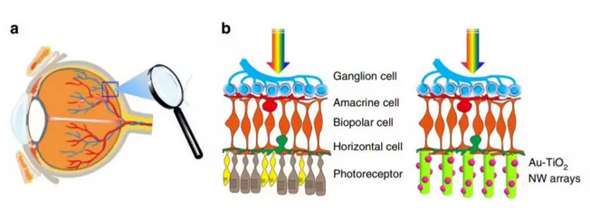 这正是这支研究团队的突破所在。复旦大学的郑耿锋教授、张嘉漪研究员与同事们一道,研发出了一种涂有金纳米粒子层的二氧化钛纳米线阵列。这种创新材料可以用作人造光感受器,替代视网膜关键细胞的功能。具体来说,由于这些材料的特殊属性,在光的刺激下,它们能产生电压,从而有望刺激邻近的神经元,产生视觉应答。