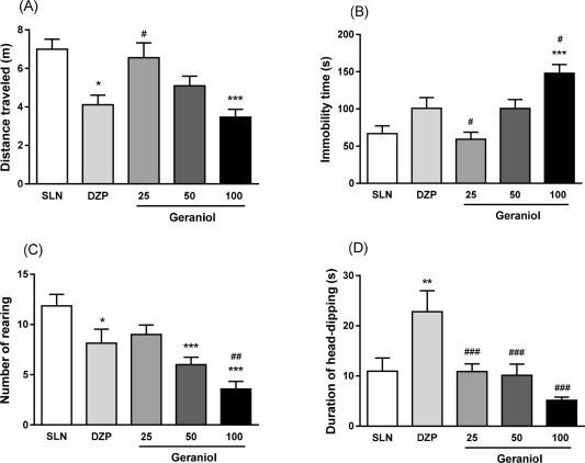 摘要:香叶醇是从芳香植物精油中提取的一种单萜醇,具有抗炎、抗菌、抗氧化和神经保护等特性。研究了香叶醇对大鼠行为和脑波模式的影响。雄性大鼠给药香叶醇(25、50和100 mg/kg).采用多孔板(HB)和开放场(OF)测试分别评估焦虑和运动行为。此外,巴比妥酸诱导睡眠时间(BIST)用于分析镇静作用。最后,利用脑皮层电图(ECOG)记录来表征脑电波的波形。结果表明,香叶醇能缩短大鼠的行走距离、后肢站立次数,并能增加HB和试验中的静止时间。在BIST试验中,香叶醇给药可延长动物的睡眠时间,但不延长动物的睡眠潜伏期。此外,香叶醇处理的动物,在总频谱功率中δ波的百分比增加。综上所述,结果表明,香叶醇对大鼠中枢神经系统有抑制作用。关键词:镇静 单萜烯 脑电波 催眠 天然产物简介:香叶醇是姜、柠檬、酸橙、薰衣草、肉豆蔻、柑橘、玫瑰等精油的重要组成部分,是几种芳香草本植物油中的主要无环单萜类,是从大马士革蔷薇、摩纳达瘘管、摩尔多瓦海龙和冬青中分离出来的。这种物质因其玫瑰般的芳香而广泛用于香水和厕所溶液中。一些研究报告了香叶醇对无脊椎动物和脊椎动物中枢神经系统(CNS)的影响。香叶醇对丙烯酰胺诱导的氧化应激、线粒体功能障碍和神经毒性具有神经保护作用。一项研究中,香叶醇预处理以剂量依赖的方式改善了MPTP中毒的帕金森病小鼠的神经肌肉损伤、酪氨酸羟化酶的表达和α-突触核蛋白的表达。接受香叶醇预处理的动物的运动障碍均有改善。香叶醇对慢性不可预测的轻度应激模型小鼠显示抗抑郁作用。香叶醇治疗3周的动物显示抑郁相关行为减弱。进一步证明香叶醇是一种可能的抗惊厥药。在这项研究中,发现香叶醇增加了第一次戊四唑诱导的痉挛的潜伏期,并保护动物免受癫痫发作。戊四唑是一种竞争性GABAA受体拮抗剂。许多单萜类具有抑制、镇静、催眠和抗焦虑作用。花生茎叶水提物的主要成分之一是芳樟醇。这种提取物通过影响小鼠大脑、脑干和小脑的神经递质水平而具有镇静-催眠作用。在戊巴比妥诱导的睡眠试验中,异普利二醇、新异普利二醇、(±)-异丙二醇、(-)-月桂醇、(+)-顺式月桂醇、(±)-新薄荷醇也显示出抑制作用,表明其具有镇静作用。我们假设香叶醇对中枢神经系统也有抑制作用。本研究旨在探讨香叶醇对大鼠皮层电图(ECOG)功率谱相关行为的影响。方法:将Wistar大鼠(3-4个月)随机置于适当的笼子中,在受控温度(22±1°C)和12 h光/暗循环条件下,自由获取食物和水。动物的年龄(90-120天)和给药途径的选择是基于先前对Wistar大鼠进行行为测试和ECOG的研究,无论是否进行预处理。地西泮(DZP)、硫喷妥钠、聚氧化乙烯山梨醇单酯(Tween 80)和香叶醇(98%)在生理盐水中稀释,腹腔注射(I.P.)1 ml/kg。孔板试验:孔板安装装置是一个木箱(66×56×47厘米),地板上有16个等距孔(3厘米直径)。将动物随机分为以下组:接受赋形剂的对照组(生理盐水,n=7),接受25、50或100 mg/kg(n=15-16)香叶醇的三个实验组; DZP组(0.5 mg/kg,n=7)。30分钟后,将每只大鼠置于孔板右下角,记录5分钟。在孔的表面下,传感器计算出头部下潜的持续时间(头部下潜的次数)。评价的参数有:行驶距离、固定时间、饲养次数和头下潜持续时间。每次试验后,仔细清洁仪器的地板,以去除先前路径的痕迹。旷场试验:旷场试验包括一个圆形仪器(直径81厘米,高65厘米),由木头制成,涂上黑色漆。将大鼠随机分为5组:SLN(生理盐水0.9%,n=11)、DZP 1.5 mg/kg(抗焦虑阳性对照,n=7)、DZP 5.0 mg/kg(镇静阳性对照,n=8)、香叶醇25、50或100 mg/kg(n=6-8)。30分钟后,通过自由探索(5分钟)将每只大鼠置于旷场的中心。对整个场地的行进距离(m)、不动时间(s)和后肢站立次数进行了评价。巴比妥酸诱导睡眠时间(BIST):动物分为三组:生理盐水(n=12)、香叶醇100 mg/kg(n=12)和DZP 5.0 mg/kg(n=14)。30分钟后,给每只大鼠注射硫喷妥钠(60 mg/kg),并放入一个盒子中。对每只动物评估翻正反射的消失时间(潜伏期)和恢复时间(睡眠时间)。外科手术:手术前,大鼠腹腔注射氯胺酮(100 mg/kg)加二甲苯嗪(10 mg/kg)麻醉。在确认麻醉状态后,将动物置于立体定向框架内。局部麻醉剂(0.1ml, 2%利多卡因)经皮注射到头部暴露组织。使用以下来自Bregma的立体定位坐标创建了三个孔来植入电极组:正面(ap:+2 mm;ml:+1.5 mm)、顶骨(ap:-4.3 mm;ml:-2 mm)和枕部(ap:-10.1 mm;ml:+1.5 mm)。三个螺钉植入三个硬膜外皮质区域,用作电极。它们通过一个小插接件连接到插脚上,并插入了数据采集线。电极用牙科丙烯酸树脂固定在头骨上,动物术后恢复5-7天。皮层脑电图数据采集与处理:在给药香叶醇(100 mg/kg)1小时后,在动物清醒的情况下获得皮层电图(ECOG)记录。信号被放大了。使用windaq采集系统进行数字化(采样率1000赫兹)和数据记录。在分析前和分析过程中,目视检查ECOG记录,丢弃含有脑电图的伪影。记录后,将原始ECOG分为11个间隔,每个间隔5分钟。利用Matlab程序对ECOG进行了功率谱分析,并用PWELCH函数计算了ECOG的功率。得到了四种主要ECoG带宽——δ(0.5-4赫兹)、θ(4-8赫兹)、α(8-13赫兹)和β(13-30赫兹)的功率谱的数字值。ECOG波的功率用总频谱功率的百分比表示。结果:香叶醇对行为的影响:在孔板试验分析中,单因素方差分析(ANOVA)显示了治疗对所有参数的显著影响:距离、不动时间、后肢站立次数和头部下潜时间。与生理盐水组相比,香叶醇(100 mg/kg)和DZP 0.5组降低了行走距