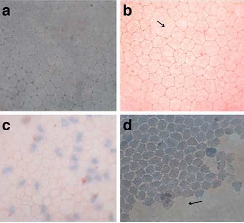 摘要:兔子目前不是研究角膜内皮疾病的好模型。因为他们的角膜内皮细胞(CEC)保持高的增殖能力。本研究的目的是评估角膜内皮损伤后在离体兔前房内注射苯扎氯铵(BAC),研究旨在培养角膜内皮疾病动物模型最合适的起始剂量。结果:经结膜入路摘除术获得40只兔的眼球,并根据注射的化合物分为8组:对照组(无注射),BSS,递增的BAC浓度(0.005%,0.01%,0.025%,0.05%,0.1%和0.2%)。在0, 6, 24和48小时,进行眼前节、视网膜镜和角膜镜的眼部检查,最后对角膜进行染色,并在光镜下观察角膜形态和死亡率。相比于BSS,角膜内皮细胞密度在0.025% BAC浓度开始明显下降,平均细胞面积、角膜水肿和角膜厚度分别在0.05%、0.005%和0.1% BAC浓度下显著增加。相比于对照组和BSS组,浓度为0.05%的BAC及以上引起CECs多形性和死亡率显著增加。结论:体外实验前房注射BAC诱导兔角膜内皮细胞的毒性。然而,需要进行体内验证以建立所需的模型,其中0.05%的BAC是一个建议的起始点。关键词:内皮细胞;角膜内皮;角膜内皮营养不良;内皮变性背景:角膜内皮(CE)是角膜内表面的一层细胞,其主要功能是控制角膜的水化,从而保持其透明性。CE有足够的角膜内皮细胞(CEC)并在整个生命保存这个功能,当CECs数量减少时,剩余的细胞反应增加它们的大小并改变它们的形态,但如果细胞丢失过大,这些代偿性改变是不够的,内皮细胞代偿失调发生。导致角膜水肿和部分或完全丧失角膜透明度。不幸的是,在人类体内的细胞增殖能力、灵长类动物和小动物是很有限的。在目前影响人类CE的疾病治疗中,已经描述了几种类型的内皮角膜移植技术,如弹力剥内皮角膜移植术(DSEK / DSAEK)及后弹力层角膜内皮移植术(DMEK). 修复内皮损伤技术的理想动物模型应该在解剖学和生理学上与人体模型相似。猪、狗和猫是眼科研究中常用的动物模型,尤其是在视网膜研究中,但它们在角膜研究中并不常用。本文介绍了几种组织工程化CE的实验动物模型,包括猪、猫、猴、鼠、鼠和兔。由于它具有高可用性、低成本、体积小、操作方便等优点,在人类眼科学研究中得到广泛应用。目前,兔子不是研究CE疾病的好模型因为他们的细胞保持高的增殖能力。解决这一特殊特性可能会允许这种物种用于此目的。苯扎氯铵(BAC),季铵化合物,是最常用的眼用制剂中的防腐剂,浓度范围0.004%和0.025%之间。然而,兔体内高浓度的BAC对角膜有毒性作用,影响CE和其他眼部结构的完整性。此外,外用BAC可诱导泪膜干燥、角膜上皮增厚、杯状细胞丢失、结膜炎细胞浸润和增殖,结膜或小梁细胞促凋亡作用。在体内和体外兔前房注射BAC在之前已有报道。但据作者所知,前房注射BAC液对家兔CE的毒性作用尚未结合体外显微镜检查和活体染色评估。这项研究的目的是双重的。首先兔眼前房注射BAC评估血管内皮损伤,建立最合适的起始剂量以获得一种可重复的内皮疾病体内模型。方法:动物和样品:该研究共纳入结膜入路摘除的40只兔眼,健康成年新西兰兔20只,性别不同、体重2至3公斤,年龄8到12周之间。无菌纱布放入无菌容器中,眼睛被放置在上面,5ml的冷却生理盐水溶液倒入并覆盖它,形成一个潮湿的环境。初步评估:摘除6h内通过裂隙灯、角膜内皮显微镜和角膜厚度对其评估,在暗室中对所有的眼睛进行角膜和眼前段的眼科检查。只有无角膜和/或眼前段疾病的眼球纳入研究中(n = 40)。眼球放置在一个自制的甲基丙烯酸甲酯眼球放置器上,使用非接触镜面显微镜检查。所有的程序都由同一个研究人员进行,保持工作距离为25毫米。如果他们出现角膜失代偿,损坏的CEC,CEC的损失,或CE存在炎症细胞眼睛被排除在研究之外. 从角膜中央区域得到三显微照片。获得平均细胞面积和内皮细胞密度,测量中央角膜厚度。前房内注射:选定的眼睛(n=40)根据注入物质被分为8组(n = 5):对照组(注射)、BSS组和6个实验组(0.005%,0.01%,0.025%,0.05%,0.1%和0.2%的BAC)。研究中使用的不同的BAC化合物是在无菌条件下制备的。以BSS作为稀释剂。所有的前房内注射在角膜缘处由同一人在放大镜下使用27G针操作。注射后立即将针头取出。一滴或两滴房水可以被动地通过针头中心排出,然后将0.1毫升适当的化合物小心地注入前房。然后在注射部位用结膜钳施压20秒,以避免液体渗漏。注射后的评估:在注射后6、24、48h对角膜进行观察。角膜水肿分级从0(无)-4(非常严重)。在整个实验过程中,眼睛被保存在4°C潮湿的室内。角膜内皮细胞活体染色:注射后48h进行评估,角膜切除2 - 3毫米巩膜环。将内皮侧放置在聚四氟乙烯支架上,以减少起皱和变形。用台盼蓝和茜素红染色测定CECs损伤。将0.025mg台盼蓝放入10ml的0.9%生理盐水中制备0.25%的台盼蓝染液。将0.02mg茜素红粉稀释到10ml 0.9%生理盐水,制备0.2%茜素红染色稀释液。该制剂的pH调节至4.2,受损细胞可被台盼蓝染色,并呈深蓝色染色;茜素红允许CECs间边界的可视化,因为它们看起来是红色的。染色后,在光学显微镜下,对每个样品做了几个放射状切口,以便在检查前使角膜变平。并在40倍镜下对其进行观察,测量死亡率和多形性程度。对于细胞活力,如果核蓝染–表明CECs被灭活,如果核蓝染为33%或更少的比例,表明死亡率低。如果这个比例是34和66%之间,它被视为死亡率中等水平;如果死去的CECs率为67%或更高,表现为高死亡率水平。结果:对照组(无注射)和BSS组比较,以观察是否前房注入BSS可以