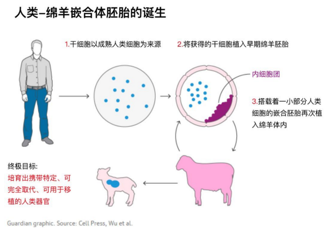 Ross 补充了几个使用绵羊胚胎的优势,其中包括它们能够应用简单的体外受精技术培育而成,并且需要植入成年绵羊子宫所需的胚胎数量更少,这意味着整个实验所需的胚胎更少。“我们一般给每个受体猪植入 50 个胚胎,”Ross 说。“给绵羊我们只需要每个受体植入 4 个胚胎。”绵羊与我们一样,具有功能明确的器官——例如心脏和肺,并且实验证明它们的胚胎能够与山羊胚胎嵌合,生出“山绵羊”。与猪一样,绵羊的器官尺寸适合人体。以猪为对象的研究仍然在进行,Ross 说,他们注意到猪具有其他优点,包括发育速度及每次生产的幼崽数量更多,这意味着更少的动物能产生更多的实验数据。然而伦理方面的忧虑比比皆是,就比如嵌合体是否能够发育出像人类一样的大脑和思维就值得担忧。“我也有同样的担忧,”Ross 说,为此研究团队正在关注嵌合体中人类细胞的最终发育方向。“如果我们的实验结果表明人类细胞最终会因此而产生了动物的脑袋,我们将永远不会再继续研究。”他说。Nakauchi 对于人类终将能够获得从动物体内发育的器官保持乐观。“这可能会需要 5 年,甚至 10 年,但我坚信最终我们会做到的,”他说。Nakauchi 同时也认为那些表示担忧的观点并不重要:“目前人类细胞的分布少之又少。根本不可能会生出长着人脸或者人脑的猪,”他说。“我们已经发表了几篇表明我们具有锁定目标区域的能力,所以我们能够避免人类细胞分化出大脑或生殖腺。”其他潜在问题,包括动物体内的病毒的 DNA 可能将感染人类细胞,以及人类器官可能会具有由宿主动物细胞组成的血管。“这样的器官一旦移植入人体将会引起免疫系统的排斥反应——很可能将会属于超急性排异反应,”来自英国弗朗西斯·克里克研究所(Francis Crick Institute)的干细胞生物学及发育遗传学部的负责人 Robin Lovell-Badge 说。然而,近期在基因编辑技术方面的进展使科学家们获得不携带病毒的猪崽们成为可能,一定程度上为此类研究铺平道路,同时 Ross 指出在进行器官移植后人类细胞或许能够取代残存的宿主动物细胞。最近,美国国家卫生研究院 (National Institutes of Health) 暂停了对这项研究的经费投入,然而通过一系列审查过程,暂停将可能被取消。在英国的科学家们必须向内政部申请进行此类研究的许可。