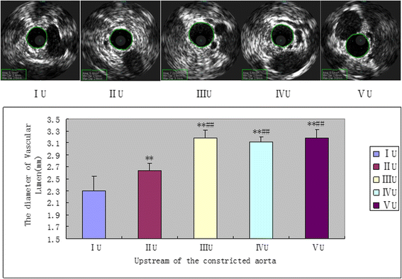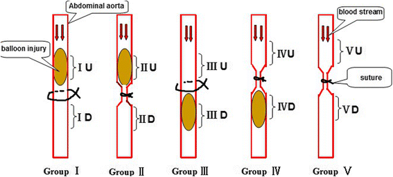 方法:我们建立了一个以主动脉插管为模型的部分腹主动脉缩窄模型,该模型与动脉粥样斑块狭窄的血流动力学特征相似。进一步研究球囊损伤对SS与内膜增生的关系。四周后,用数字减影心血管造影术(DSA)和血管内超声(IVUS)对腹主动脉进行了评估。对石蜡块血管切片进行形态计量学分析内膜增生和CD31免疫组化染色评价内皮化率。结果:在狭窄的上游,与正常SS相比,SS的改变导致内膜增生。与正常SS比较,通过内皮化率验证球囊损伤后狭窄的上游SS可以促进血管再内皮化,从而减轻内膜增生。结论:球囊损伤后狭窄的上游SS,不是下游的SS通过促进血管再内皮化抑制内膜增生。关键词:血流动力学 内膜增生 剪应力背景:动脉粥样硬化及其并发症是大多数国家的主要死亡原因。虽然许多全身性因素,包括糖代谢异常、高脂血症、高血压和吸烟,被鉴定为危险因素,扰流更可能发挥了举足轻重的作用,在动脉粥样硬化的发生发展中具有一种非随机优先模式,其特征是分支或弯曲动脉壁的低切应力和振荡壁面切应力(SS)。越来越多的证据表明,SS是血管损伤发生的罪魁祸首。。随着血管内超声(IVUS)和计算流体动力学的应用,研究人员证明SS可以用于预测支架内再狭窄引起的内膜形成和评估球囊血管成形术后血管重建的进展。研究表明,高SS与支架内再狭窄和靶病变血运重建有关,即使在成功的球囊成形术中也是如此。然而,球囊扩张术后新生内膜增生与新生内膜增生的关系有待进一步证实。血管内皮细胞(EC)是内衬血血管壁的重要组成部分和直接暴露于紊乱血流。同时,内皮细胞可能受到各种化学和机械刺激的影响,最终调节体内平衡功能。EC功能障碍是血管疾病,包括动脉粥样硬化和血栓形成的一个重要病理因素。近年来,已经建立了多种体外模型来调节内皮细胞的剪切流动,目的是模拟体内内皮细胞流动环境的特征。这些模型帮助研究人员探索其对SS的反应机制,包括对EC形态、细胞骨架组织、增殖、迁移、通透性和连接蛋白、EC信号和基因表达的影响。多项研究探讨了SS对血管结构的影响。然而,SS在血管重塑和新生内膜形成中的作用还没有完全阐明,尤其是体内的扰动流动。应该建立一个适当的模型来探讨这个问题。因此,我们用一个圆筒形的套管将家兔接受腹主动脉缩窄术。它模拟动脉粥样硬化引起的狭窄的血流动力学特征,探讨球囊损伤后SS对血管重塑的影响。我们假设,这种收缩性血管模型,类似于动脉粥样硬化斑块,会在收缩血管的上游和下游引起不同程度的内膜增生,不论是否伴有球囊损伤。方法:动物:40只新西兰白兔,体重2.2–2.6 公斤,雄性,随机分为5组(n = 8 每组),单笼饲养,自由采食和饮水,术前至少适应1周。兔用3%戊巴比妥钠麻醉(1 毫升/公斤)然后右股动脉插管四导引鞘所有导管随后通过鞘引入腹主动脉。。肝素钠(200 IU/kg)是动脉内注射。,正中矢状切开肾动脉和髂总动脉血管 中间约1厘米长的分离,等待下一步的分组决定。每只家兔取腹主动脉作基线血管造影和IVUS检查。所有操作均处于无菌状态。手术操作:组1,仅损伤主动脉球囊,刚好位于分离动脉的上游,并以手术缝合而不结扎作为对照。。组2,不仅球囊损伤主动脉,动脉也在分离动脉的上游。用圆筒形套管也部分收缩了孤立的动脉(直径约2 毫米,长度5 毫米)外科缝合结扎。组3:仅损伤主动脉球囊在分离动脉的下方,并以手术缝合而不结扎作为对照。组4:损伤主动脉球囊,位于分离动脉的下游,用圆筒形套管部分隔离狭窄的动脉,由外科缝合线结扎。组5:仅用外科缝合线连接的圆筒形套管部分分离狭窄的动脉。在球囊扩张损伤水平,主动脉的扩张率为1.2和1.3之间,根据基本IVUS直径的数据在10间隔两次在同一地点,记录数字减影血管造影(DSA)和IVUS图像。术后无菌缝合切口,静脉注射抗生素预防感染。动物被允许恢复正常饮食。四周后,用DSA和IVUS检查家兔。过量戊巴比妥钠安乐死,主动脉从肾动脉解剖至髂分叉,用10%中性甲醛灌注固定过夜。固定的主动脉嵌入石蜡块进行形态计量学和免疫组织化学研究。形态:从两个不同的部位,即收缩动脉和假动脉的上游和下游部位获得横截面。标本切成连续5 μm截面一般组织学染色与苏木精-伊红(HE),Image-Pro Plus 6图像分析系统测定管腔面积和内弹力层面积和新生内膜面积、。对相应节段的平均面积(N = 3)进行统计分析。免疫组织化学:切片脱蜡和水化,切片在PBS 3%过氧化氢处理10 min 抑制过氧化物酶的活性。抗原修复是用柠檬酸盐缓冲液(pH 6)。4°同CD31单克隆抗体孵育过夜。PBS冲洗后,切片与羊抗鼠IgG室温,孵育20 min ,后同SABC复合物孵育再次PBS冲洗,DAB染色,苏木素复染中,脱水,和固定。对照组执行同样的程序,其中主要是由非免疫血清抗体进行更换。结果:家兔模型的建立:实验四只兔(组2两只,组3和组4各1只),在实验过程中因过度麻醉、血栓形成、失血性休克、球囊损伤而死亡,其余兔子全部完成研究。基线平均体重2.36±0.25公斤 ,四周后体重3.14±0.16 公斤。五组间体重无显著差异,提示模型成功建立。评估血液动力学证实部分腹主动脉缩窄后血管SS的改变。对这些常规测量进行评估,以确定变SS模型。狭窄的上游SS减轻球囊损伤后管腔的丢失:四周后,用血管内超声测量分离动脉的上、下游血管直径,以评价球囊损伤和/或狭窄的血管重构。在分离动脉的上游,与其他三个无球囊损