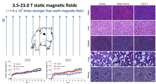 3.5-23特斯拉稳态强磁场处理小鼠两小时总体来讲比较安全。虽然23特斯拉对其摄食和体重增长有一定影响,但21.9特斯拉及以下则无影响。中科院强磁场科学中心供图。中国科学院强磁场科学中心今天(6月5日)发布消息称,该中心研究员张欣课题组利用稳态强磁场大科学装置,在20特斯拉级强磁场生物安全性方面取得全新进展,首次报道了20特斯拉级以上强磁场对正常小鼠的主要生理生化指标等的影响。相关成果在线发表于国际神经成像领域期刊《神经图像》( Neuroimage )上。团队成员前期先进行了小规模的实验,检测了3.7~24.5特斯拉强磁场对荷瘤小鼠的影响,处理时长9小时,发现可以对肿瘤生长产生一定的抑制作用。虽然小鼠的大多数生理生化指标无显著异常,但是其肝脏受到了强磁场的影响。在前期实验的基础上,团队成员降低了磁场强度,缩短了磁场处理时间,在3.5~23特斯拉场强下,对112只正常小鼠处理2小时,之后继续正常饲养三周,全面系统地检测了其生物安全性。通过病理切片、血常规检测和血液生化分析等,科研人员发现,这种处理并未对小鼠的主要脏器(心、肝、脾、肺、肾),血常规指标以及肝肾功能、脂质代谢和离子浓度等主要生理指标造成明显危害。虽然23特斯拉处理组小鼠的摄食和体重增长受到了一定影响,但是21.9特斯拉及以下的强磁场就没有明显影响了。“这一研究对界定强磁场生物安全界限,开拓强磁场在医疗和仪器设备等领域中的应用都具有积极的指导意义。”张欣说。据了解,随着科技的发展,为提高组织分辨率和成像功能,医院内应用于核磁共振扫描仪的稳态磁场强度已从最初的0.5特斯拉普遍提升到了1.5特斯拉或3特斯拉。然而,由于10特斯拉以上强磁场设备的相对短缺,稳态强磁场生物安全性的研究目前十分缺乏,而20特斯拉以上强磁场安全性的研究更接近空白。因此,探索稳态强磁场的生物安全性对更高场核磁共振扫描仪的开发和临床应用具有重要的科学和现实意义。相关论文信息:https://doi.org/10.1016/j.neuroimage.2019.05.070 小鼠在强磁场下到底安全吗?科学家给出答案