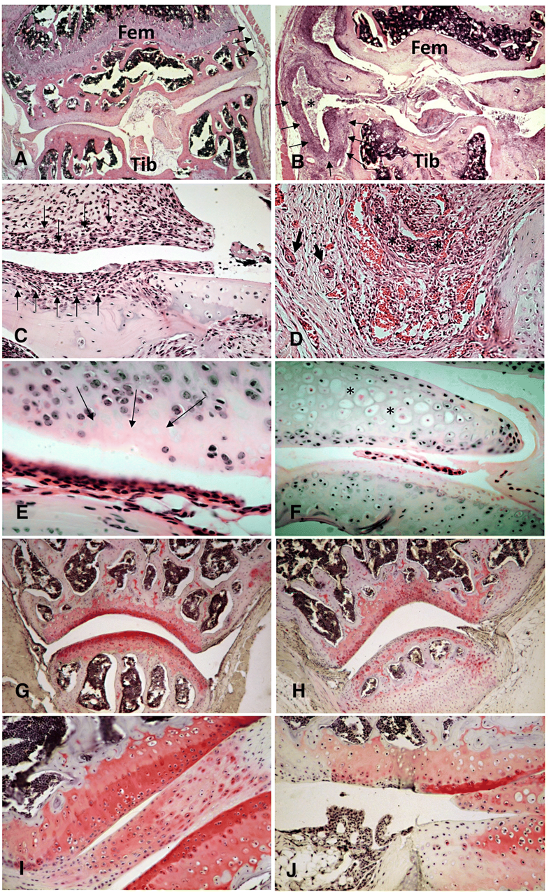 摘要:背景:类风湿关节炎(RA)患者的成纤维细胞样滑膜细胞(FLSS)在联合移植模型中被自主激活以维持炎症和关节破坏。为了阐明这一改变行为的诱导机制,我们在一个转移模型中研究了小鼠抗原诱导关节炎(AIA)中FLSS的促关节炎潜能。方法:对FLSS分离、体外扩增和转移到严重联合免疫缺陷(SCID)小鼠膝关节腔。结果:来自AIA小鼠的FLSS能够将关节炎转移到受体SCID小鼠体内。FLS转移引起慢性关节炎,炎性细胞增多,软骨破坏明显。由于从急性关节炎分离的细胞完全有能力转移关节炎,因此在FLSS中标记关节炎性不需要长期炎症。在我们的单关节关节关节炎模型中,我们还观察了从对侧非关节炎关节分离出的FLSS中的关节生成潜能。结论:我们发现,在关节炎发展的早期,FLSS转化为关节生成细胞。这挑战了目前关于这些细胞在关节炎发病机制中的作用的假设,为进一步的机制研究开辟了道路。关键词:关节炎 滑膜成纤维细胞 关节破坏背景:类风湿性关节炎(RA)是一种主要影响关节的慢性炎症性疾病。类风湿关节炎的主要组织学特征是来自先天和适应性免疫系统的细胞浸润,滑膜增生,软骨和邻近骨破坏。成纤维细胞样滑膜细胞(FLSs)是滑膜增生的主要细胞类型,在RA发病中起着关键作用。通过产生不同的炎性细胞因子和趋化因子,它们可以招募炎性细胞并维持其在炎症关节中的持久性。FLSS还产生基质降解酶,如基质金属蛋白酶(MMPS)和组织蛋白酶,因此直接参与关节破坏。FLSS的一个显著特征是在组织培养中或在严重联合免疫缺陷(SCID)小鼠植入后维持其激活表型的能力。由于RA患者的滑膜含有不同细胞类型的混合物,在以后的研究中,在转移到SCID小鼠之前分离出FLSS。在这种嵌合体模型中,FLSS附着并侵入共同植入的软骨,并招募炎症细胞。此外,破坏性成纤维细胞迁移并破坏未受影响的软骨,移植到免疫缺陷小鼠的其他解剖位置。因此,尽管该模型不能反映RA复杂发病机制的所有方面,但它支持了一种观点,即FLSS的永久自主激活是疾病进展的核心。由于最终引发类风湿性关节炎的免疫过程比临床疾病早很多年,最终导致FLS激活和疾病的级联事件不能从患者材料中重建。因此,明确需要动物模型来更好地了解成纤维细胞对关节炎慢性炎症和关节破坏的作用。迄今为止,只有一项已发表的研究使用克隆的永生化FLSS证实了在肿瘤坏死因子(TNF)转基因小鼠模型中观察到的FLSS的关节生成行为。目前尚不清楚这种行为是否也可以印证在从关节炎野生型小鼠分离出的非永生FLSS上。基于以上使用类风湿关节炎患者FLSS的研究,人们普遍认为这些细胞的关节炎促进作用是长期慢性炎症的结果。因此,我们旨在阐明在我们的小鼠模型中,慢性炎症是否是导致FLSS关节炎性转化的强制性因素。如果急性(短期)关节炎足以引起FLS行为的持续变化,可以假设这些细胞在慢性关节炎的诱导和持续过程中功能一致。研究目的是回答关节炎发病机制中FLSS生物学的一些基本问题。我们使用抗原诱导性关节炎(AIA),这是由关节内注射抗原到预先免疫相同抗原的动物膝关节腔引起的。该模型的选择是因为其100%的发病率和病源性变化的时间进程。这些特征允许系统地研究关节炎和非关节炎膝关节的FLS行为。方法:动物和关节炎诱导:将6~12周龄雌性C57BL/6小鼠皮下注射50μl含100μg甲基化牛血清白蛋白生理盐水溶液,2 mg/ml热灭活结核杆菌同50μl完全弗氏佐剂乳化液,诱导关节炎。同时,给小鼠注射5×108热灭活百日咳杆菌。第0天,单次注射溶100μg MBSA的25μl生理盐水溶液至右膝关节腔,诱发关节炎。左膝关节未经治疗。动物被处死,在急性期(第7天之前)或慢性期(第7天之后)解剖膝盖准备滑膜细胞。采用6-8周龄的BALB/C SCID小鼠作为受体。制备FLSS:通过从正常、免疫或关节炎小鼠(在关节炎诱导后的不同时间点)的膝关节解剖的滑膜组织中的外植体培养获得FLSS。用0.1%胰蛋白酶在磷酸盐缓冲液(PBS)中消化30分钟,洗涤后用溶于PBS的0.1%胶原酶P消化2小时。将培养物置入含10 mM 4 -(2-羟乙基)-1-哌嗪乙烷磺酸(HEPES)、1 mM丙酮酸钠、100 U/ml青霉素、0.1 mg/ml链霉素、2 mM谷氨酰胺和20%胎牛血清的DulbCo改性EAG培养基(DMEM)中,37度,5% CO2条件下培养。每天都更换培养液。滑膜细胞在7天内从移植物滑膜中出现。用0.25%胰蛋白酶/0.02%乙二胺四乙酸消化分离FLS,并在添加10%胎牛血清的完全DMEM中继代培养。滑膜细胞反复传代以丰富FLSS和耗尽巨噬细胞。在一些实验中,我们用抗CD11b的磁细胞分选法在第一次通过后去除细胞培养物中的巨噬细胞,然后用抗大鼠dynabeads?进行筛选。使用磁性粒子浓缩器进行分离。所有用于转移实验的FLS制剂均含有>95%的成纤维细胞,呈典型的纺锤形形态。根据制造商的说明,细胞培养用酶联免疫吸附测定检测试剂盒常规筛选支原体的感染情况。关节炎发展的细胞转移与监测:用0.25%胰蛋白酶/0.02%乙二胺四乙酸(EDTA)在PBS中收获第三至第五代的FLSS,并在PBS中洗涤和悬浮,最终浓度为1.2×107 cell/ml;然后将25μl(3×105细胞)这种悬浮液注入受者SCID小鼠的膝关节腔。用游标卡尺测量膝关节中外侧直径,观察SCID小鼠临床关节炎的发展。膝关节肿胀表现为右(注射)膝关节和左(未治疗)膝关节之间的差异。为了对关节炎严重程度进行组织学评估,在细胞移植后70-100天处死了SCID小鼠。全膝关节在4.5%Tris福尔马林缓冲液中取出并固定。用15%乙二胺四乙酸