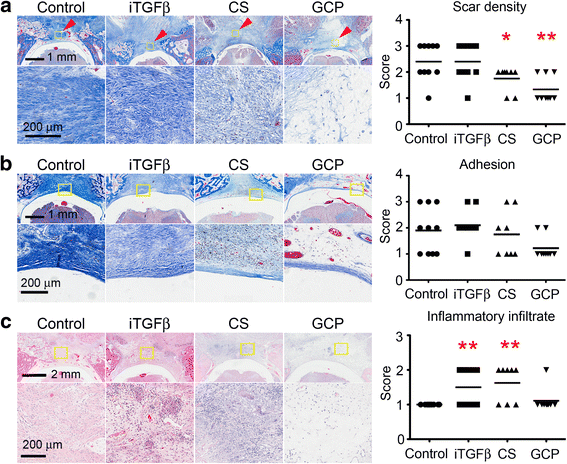 摘要:背景:TGF-β被描述为纤维化和瘢痕形成的介质。一些研究通过抑制TGF-β来减少实验性瘢痕形成。成纤维细胞被定义为来源于纤维化的细胞群,阻止成纤维细胞侵入可能损害硬膜外纤维化。为此,我们评估了作为机械屏障的生物相容性材料和TGF-β抑制剂肽在降低硬膜外纤维化中的作用。方法:对40只新西兰白兔进行了L6椎板切除术。分为四组,分为四组,每个兔子被随机分配接受胶原海绵支架(CS组),明胶基凝胶(GCP组),P144?(iTGFβ组),或未治疗(对照组)。术后4周,用组织形态测定法测定瘢痕区细胞密度、胶原含量和新骨形成。两位经验丰富的病理学家对硬脑膜粘连、疤痕密度和炎症浸润进行了盲法评分。结果:所有组的椎板切除术部位都充满纤维组织,硬脑膜出现粘连。只有GCP组胶原含量和瘢痕密度显著降低。结论:GCP治疗可降低硬膜外纤维化,但不能完全防止硬膜粘连。关键词:硬膜外纤维化 椎板切除术 TGF-β 生物材料背景:组织损伤后,组织修复过程细胞外基质成分的过度生产和沉积,形成疤痕。当疤痕在硬脑膜上形成时,被命名为硬膜外纤维化。它的存在使得再次手术更加困难,增加了手术时间和硬脑膜撕裂和神经根损伤的风险。考虑到腰椎再手术的发生率在4%到19%之间,这是脊柱手术的一个常见问题。为了防止硬膜外纤维化,尽管游离脂肪移植物有可能导致神经根或脊髓压迫,但在临床实践中,插入是一种常见的手术。此外,不同的机械屏障和抗炎疗法已被用于预防硬膜外纤维化,临床成功率可变或有限。一种理想的材料,以防止硬膜外纤维化应能够最大限度地减少神经压迫的风险,而不是干扰周围组织的愈合。它还应具有生物相容性,以尽量减少异物反应和炎症反应。转化生长因子β(TGF-β)在体内不同的细胞和组织中起着广泛的作用。TGF-β1在瘢痕组织,特别是系统性硬化中的表达增强。与组织再生相比,通过瘢痕形成愈合的伤口中发现TGF-β1含量增加。这导致了临床上用抗体和针对TGF-β1的小分子阻止瘢痕形成。为了评价TGF-β1在硬膜外纤维化中的作用,我们将抗TGF-β1合成肽p144@应用于兔脊柱手术模型。p144在肝纤维化、博来霉素诱导的皮肤硬化和硅酮假体周围纤维化的动物模型中显示纤维化减少。在其他研究中,Adcon L@和Duragen@在预防硬膜外纤维化方面显示出良好的效果。AdCON-1,明胶和碳水化合物聚合物(GCP)制成的可吸收凝胶基质,在三周内起到使成纤维细胞消失的屏障作用。Duragen@一种胶原海绵(CS),通常用作硬膜移植,允许成纤维细胞浸润,以胶原基质孔为支架,形成新的胶原,6-8周后消失。我们建立了一个椎板切除术后硬膜外纤维化的家兔模型,并评估了屏障材料Adcon L@和Duragen@以及TGF-β1阻断肽p144@对硬膜外纤维化的影响。方法:本研究使用40只新西兰白兔(体重4-5公斤),接受L6椎板切除术。创建了四个实验组:对照组,用生理盐水冲洗椎板切除术部位(n=10)。GCP组,Adcon L@被均匀地放置在覆盖椎板切除缺损的椎板切除部位(n=10)。CS组,切割Duragen@sheet以适应椎板切除术缺陷,并放置在椎板切除术部位(n=10)。iTGFβ组,p144@肽源于人TGF-β的III型受体序列,被均匀地放置在覆盖椎板切除缺损的椎板切除部位(n=10)。在以前的动物研究中已经评估了iTGFβ的细胞毒性.任何因麻醉或椎板切除术(如硬膜撕裂、神经压迫)而出现并发症的兔子均被列为不合格并排除在研究范围之外。手术:动物在L6和L7之间从一个椎弓根到另一个椎弓根接受了L6到黄韧带的完整椎板切除术。所有动物在手术前12小时禁食。动物用肌肉注射美托咪定(0.15 mg/kg)和氯胺酮(10 mg/kg)进行镇静。静脉注射2–8 mg/kg异丙酚诱导麻醉,并在整个手术过程中1.5–3%的七氟醚维持麻醉。麻醉状态下,动物俯卧在手术台的加热垫上。腰骶部用电剪刀修剪,并用聚维酮碘消毒。通过触诊确定L6,在棘突的中心做一个大约7厘米的中线切口。骨平面暴露,解剖椎旁肌肉组织达到并切开L5和L6之间的黄韧带,然后,用一个45°角的1-mm Kerrison-Rongeur,在L6和L7之间以及从一个椎弓根到另一个椎弓根,进行L6到黄韧带的完整椎板切除术,形成一个长约20 mm、宽约7 mm的缺损。手术后,用2/0聚乳酸缝线缝合筋膜。在7天内给予抗生素(青霉素/链霉素0.1 ml/kg/24 h)。所有兔子都单笼饲养,可以自由采食和饮水,而不需要固定。手术后4周,兔子被处死。组织学和组织形态学分析:为了进行组织学评估,采集脊椎,在4%福尔马林中固定1周,在8周内在脱钙溶液(10%EDTA,7.5%PVP,10 mM Trishcl ,PH 6.95)中脱钙,在分级乙醇中脱水,并嵌入石蜡中。从每个治疗组的中段和两端获取4μm厚的连续切片,并用苏木精和伊红(H&E)、马森三色和天狼星红染色来评估疤痕组织。使用蔡司AXIOCAM ICC3相机和AXIOIMAGER M1显微镜采集数字图像。对硬膜外瘢痕组织的细胞密度、新骨形成和胶原含量进行了组织形态学分析。对于细胞密度,细胞计数以每平方毫米细胞为单位,使用IMAGEJ,每个载波片15个区域,每只动物3个载波片。新骨形成面积和覆盖椎板切除的距离分别表示为面积(平方毫米)和距离(毫米),分别来自马森的三色染色部分。两名实验病理学家对疤痕密度、硬膜外粘连和炎性细胞以盲法浸润进行分级和评分。硬脑膜和纤维组织之间的黏附延伸根据He等人描述的分类进行分级。根据Preul等人使用的分类对粘附密度进行分级。炎性细胞浸润用半定量量表分级:0(无炎性细胞浸润),1(小于30%的区域被炎性细胞