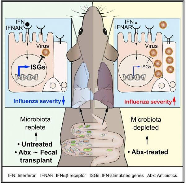 研究人员近日在《Cell Reports》杂志上发表报告称,肠道微生物刺激非免疫肺细胞中的抗病毒信号,以在感染初期抵御流感病毒。增强的基线I型干扰素(IFNα/β)信号驱动了抗病毒反应,减少了小鼠流感病毒复制和体重减轻,但随着抗生素治疗这种保护作用会减弱。"这项研究支持了以下观点:服用抗生素不当不仅会促进抗生素耐药性、消除有用的保护性益生菌,还可能使你更容易受到病毒感染。"来自英国弗朗西斯·克里克研究所的该研究通讯作者Andreas Wack说道。"在一些国家,畜牧业大量使用抗生素,用于预防感染,因此接受治疗的动物可能更容易受到病毒感染。"IFNα/β信号免疫防御病毒感染中起着核心作用。这些途径通过精细微调可以获得抗病毒保护,同时避免组织损伤的炎症。这种平衡在具有导致高干扰素产生的遗传变异的个体中是明显的。它们可以增强对病毒的免疫反应,但另一方面,它们显示出慢性自身炎症的迹象。目前还不清楚IFNα/β信号如何调节这种平衡来同时保证最小程度的炎症反应和最大程度的抗病毒保护作用。