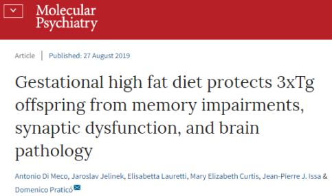 众所周知,高脂肪饮食会带来健康风险,但对于准妈妈们来说,情况可能完全不同。近日发表在Molecular Psychiatry上的一项研究表明,高脂肪饮食或可以预防孕妇后代罹患阿尔茨海默症。美国天普大学Lewis Katz医学院的研究团队首次通过动物研究证实,母亲在怀孕期间摄入大量脂肪可以防止后代大脑出现某些变化,而这些变化是迟发性阿尔茨海默症的特征。