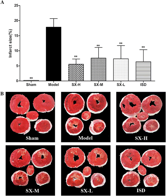 摘要:本研究的目的是探讨速效救心丸(SX)对冠状动脉阻塞引起的麻醉犬急性心肌缺血的影响。方法:通过结扎左前降支,减少90%血流诱导急性心肌缺血模型。成年杂种犬随机分为六组:模型、SX高剂量、SX中剂量和SX低剂量组,硝酸异山梨醇(ISD)和假手术组。成年犬麻醉后,仪表测量心率(HR)、平均动脉压(MAP)、左室收缩压(LVSP)、左室dp/dt,冠脉血流量(CBF),心肌血流量(MBF),冠脉血管阻力(CVR),和心外膜心电图(EECG)。使用SX后,记录血流动力学的改变,同时检测血清酶和血气分析。结果:SX对梗死面积减少有剂量依赖效应。此外,SX对血清肌酸激酶同工酶(CK-MB)活性升高,乳酸脱氢酶(LDH)、丙二醛(MDA)及超氧化物歧化酶(SOD)活性升高有显著抑制作用。通过显着降低MAP、CVR、LVSP、左心室收缩压(LVEDP)、收缩压(SBP)、舒张压(SDP),增加脑血流量和心肌血流量(MBF),SX显示有恢复心肌功能的能力。此外,SX高剂量组显著降低ST段抬高总MV和氧摄取率。结论:SX可以改善血流动力学和心肌氧代谢,减轻心肌缺血程度和范围,从而发挥显著的抗心绞痛心肌缺血作用。背景:冠心病和缺血性心肌病是最重要的心血管疾病类型。现代医学在治疗心血管疾病方面有了显著的进步。原发性治疗如抗心绞痛药物和抗惊厥药物是心血管病的首选治疗药物。SX是心脑血管疾病治疗的最有效的中成药之一。它已被用于治疗冠心病、心绞痛、心肌梗死。SX已经显示出迅速缓解心绞痛、小剂量改善症状,此外没有明显的不适症状,副作用和耐药性。最近的研究表明,SX能明显改善心肌缺血、改善微循环,减少心肌梗死的发生率,降低血液粘度,增加冠状动脉血流量,扩张冠状血管,改善心肌的血液供应。在这项研究中,我们利用结扎左前降支(LAD)制备心肌缺血模型,,探讨SX对心脏的抗心肌缺血作用。在实验过程中测量心肌梗死面积、血气变化,血流动力学和心外膜心电图、血清肌酸激酶同工酶MB水平(CK-MB),乳酸脱氢酶(LDH)、丙二醛(MDA)、超氧化物歧化酶(SOD)等参数。动物:所有犬在实验室条件下饲养,保持适度的温度和湿度,并可自由采食和饮水。驯养一周后,根据体重和心电图筛选44只健康犬,随机分为六组:模型组(生理盐水,1ml/kg),高剂量组(SX 25.60mg/ml/kg),中剂量组(SX,12.80 mg/ml/kg),低剂量组(6.40 mg/ml/kg),硝酸异山梨酯(ISD 0.80 mg/ml/kg)与假手术组(生理盐水,1ml/kg),每组动物数分别为7,7,9,6,7和8。实验中死亡的动物不包括在内。手术准备:本研究采用急性心肌缺血(AMI)实验模型。犬在手术前禁食一整夜,允许自由饮水。进行先前描述的开放式胸部麻醉犬模型。犬静脉注射30毫克/公斤戊巴比妥钠麻醉,如需要可以补充额外的剂量。采用无菌操作技术,恒温操作台使狗体保持恒温。犬气管插管,用空气呼吸器通气。经右侧颈外静脉置入聚乙烯导管,进行静脉血气分析及血液标本检查。左股动脉与聚乙烯导管连接,进行动脉血气分析和血压测量。在左第五肋间进行8~10厘米的开胸手术,心脏悬吊在心包摇篮中。从起源处分离3-5毫米冠状动脉左回旋支(LCX),超声波流量探头放置LCX血管周围测量冠状动脉血流(CBF)。分离第一、第二对角支的左冠状动脉前降支(LAD)的一段,采用同样的方法测量。穿过LAD一条双股的7.0丝线闭合两端,双丝结扎切断,从而成为两连字。第一结扎线收紧,使LAD流量减少50%,持续10分钟,然后用针收紧第二条结扎线,使血流减少90%。假手术犬在不结扎LAD的情况下进行相同的手术。将输液管插入十二指肠后进行药物治疗。结扎后三十分钟,所有的犬通过输液管注入药物或生理盐水。实验程序:血液动力学测量:冠状动脉造影导管经右侧股动脉插入左心室,然后连接到MP150模拟数字转换器。测定心率(HR)、平均动脉压(MAP)、左室收缩压(LVSP)、左室舒张末压(LVEDP),LVSP一阶导数的最大和最小值。此外,还将聚乙烯导管插入左股动脉,测量收缩压(SBP)、舒张压(DBP)和平均动脉压(MAP)。并测量CBF。心肌血流量(MBF,毫升/分钟每100克),公式为:MBF=CBF×300 /心脏重量。各自的MBF除以平均动脉压(MAP)计算冠状血管阻力(CVR)。术前、术前、术后180分钟收集血流动力学数据。心外膜心电图的测定:心外膜心电图有30个单极银丝电极,连接到MP150上,并被放置在左心室的前表面。从心外膜前表面5?×?6矩阵点记录特征电参数如心电图ST段抬高。所有数据均用脑电图PowerLab系统软件分析。在预闭塞、预给药和用药后30, 60, 90、120, 180分钟测定心外膜心电图。超过2 mV的ST段抬高被认为是计算心肌缺血程度和心肌缺血范围的缺血标准。血清酶活性与血气分析:从静脉窦采集血液样本。使用诊断试剂盒测量肌酸激酶同工酶(CK-MB)、乳酸脱氢酶(LDH)、丙二醛(MDA)和SOD的水平。采集静脉窦血和动脉血放入厌氧肝素化注射器,通过血液气体分析机立即进行氧张力(氧分压)、血氧饱和度(SO2)分析。所有血标本分别在预闭塞、给药前和用药后30, 60, 90、120, 180分钟测定。测定梗塞面积:180分钟的闭合后,摘取心脏,去除心房。用生理盐水快速洗净心室,放置-20°C 30分钟,切成5等份,然后放入1%氯化三苯基四氮唑(TTC)磷酸盐缓冲溶液10分钟。TTC染色后,存活心肌染成红色,坏死心肌仍然苍白。测量缺血区和非缺血区,利用缺血区重量/左心室总重量×100%计算各缺血面积权值。结果:SX对梗死面积的影响:分析缺血心肌梗死面积能比较直观地观察到SX对抗缺血的影响。图一显示缺血180分钟时心脏梗死面积的百