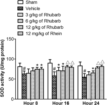 背景:由创伤性脑损伤(TBI)引起的病理、生理和生物反应使大脑受到继发伤害。大黄酸,大黄的一种重要成分,具有很强的抗氧化性。但大黄酸的机制仍不清楚。方法:本研究的目的是在大鼠脑外伤模型脑组织中识别大黄酸,并证实大黄酸是否具有类似大黄等中药的抗氧化作用。首先,超高效液相色谱-串联质谱(UPLC-MS/MS)方法用于识别大鼠大黄灌胃后大脑皮质组织中的大黄酸(CCI)。此外,为计算CCI大鼠氧化应激,测定脑组织丙二醛(MDA)、过氧化氢酶(CAT)、超氧化物歧化酶(SOD)、谷胱甘肽(GSSG)以及还原型谷胱甘肽(GSH)/GSSG的比例。结果:结果表明,大鼠创伤性脑组织对大黄酸有明显的吸收作用。大黄,大黄酸升高SOD、CAT活性、GSH水平,及GSH/GSSG比值,降低MDA和GSSG水平。结论:数据表明大黄和Rhein有可能作为创伤性脑损伤(TBI)的神经保护药物,大黄酸作用类似于其母体药大黄。关键词:大黄酸 大黄 创伤性脑损伤 氧化应激 神经保护作用背景:创伤性脑损伤(TBI)是世界范围内的一种危及生命的疾病。多数中国人因运动时受伤,或在办公室或家中意外摔倒,以及摩托车受伤而遭受TBI。由于社会对疾病的认识不足,TBI被称为"无声流行病"。 TBI后继发性脑损伤引起病理、生理和生物反应,导致大脑功能障碍。在生物学和化学过程往往导致链反应,可引起炎症细胞,缺乏精力、兴奋性毒性、细胞凋亡和氧化应激。在前面提到的过程中,氧化应激起着关键的作用。促进炎症和其他反应导致氧化应激加重,因为氧化加剧炎症和其他反应,这是一个恶性循环。氧化应激发生于TBI后1小时,成为立即开始的病理反应。因此,抗氧化策略成为急性期TBI治疗的关键。大脑容易受到氧化损伤,由于简单的神经元膜过氧化。由于丰富的脂肪酸,它可以很容易地氧化,脑组织需要大量的氧气,占总耗氧量的20%。大脑富含脂类,因此更容易受到自由基的伤害。活性氧(ROS),包括超氧阴离子、羟基自由基和过氧化氢(H2O2),被认为是参与细胞生长和分化的信号传导中的第二信使。如果ROS的产生和消除不平衡,生物系统中的氧化应激就会爆发。过量的ROS生成是导致TBI发展中氧化应激的一个重要因素。过氧化氢,超氧阴离子,羟基自由基和其他活性氧是由有氧环境中的细胞产生的。这些自由基可以与生物分子如DNA、碳水化合物、蛋白质和脂类相互作用,并破坏各种细胞成分。脑内富含过氧化氢酶(CAT)、超氧化物歧化酶(SOD)、谷胱甘肽(GSH)等抗氧化酶,以防止氧化损伤。同时,丙二醛(MDA)、谷胱甘肽(GSSG)导致脑组织中的氧化应激。在氧化条件下,两GSH分子捐赠一个电子转换成GSSG。GSH/GSSG的摩尔比是一个强大的氧化应激和疾病风险指数。不幸的是,TBI的治疗效果远远不能令人满意,因为它的发病机制是由极其复杂和相互作用的机制驱动的。西药抗氧化策略失败。科学家开始从中药中寻找有潜力的创新植物成分,用于抗氧化治疗。近年来,大黄对严重脑损伤所致的脑功能障碍有保护作用。大黄对大鼠脑组织脂质过氧化有抑制作用。大黄能显著降低乳酸脱氢酶的释放和DNA碎片,这在细胞凋亡过程中起着重要作用。近年来,大黄用于治疗脑外伤,取得了令人满意的疗效。大黄酸作为大黄的重要活性成分,具有丰富的有效氧化性能。然而,治疗TBI的机制尚不清楚。因此,本研究旨在确定大黄酸的抗氧化作用,进一步确定大黄酸是否可以作为大黄的靶向治疗材料用于治疗TBI。方法:动物和手术操作:200-300克的雄性SD大鼠,分别饲养在标准条件下,温度22±2°C, 12-12明暗循环,相对湿度50±10%。试验前12小时不喂饲大鼠,但饮水充足。108只SD大鼠随机分为六组,每组进行3个时间点的疗效试验(8、16和24 h):(1)对照组:大鼠TBI后分别灌胃给予等量生理盐水(0.9%氯化钠)(n = 6);(2)假手术组:大鼠行相同的手术除大脑皮层没有经历过创伤(n = 6);(3)12g/kg大黄治疗组:进行相同的创伤后大鼠口服大黄(n = 6);(4)6g/kg大黄组:进行相同的创伤后大鼠口服大黄(n = 6);(5)3g/kg大黄组:进行相同的创伤后大鼠口服大黄(n = 6);(6)12mg/kg的大黄酸组:进行相同的创伤后大鼠口服大黄酸(n = 6)。采用皮层电刺激(CCI)建立大鼠创伤性脑损伤模型。采用3%戊巴比妥钠麻醉雄性SD大鼠,通过三维框架空气锤进行操作。然后我们在颅骨右侧中央间隙的一侧进行手术,通过一个手持环锯在位于前囟和λ之间的中心进行开颅手术,只损伤实验大鼠脑表面的一侧。在损伤指标中,有一个碰撞深度为5毫米,持续500毫秒,每秒钟6米。我们还对对照组大鼠做了开颅手术,但没有锤击老鼠的大脑。然后我们缝合伤口,弄醒大鼠,放在加热垫子上30到60分钟保持正常体温。每天观察受伤的老鼠至少4小时。UPLC-MS/MS 检测CCI大鼠脑组织中的大黄酸:CCI大鼠口服大黄,确定脑组织吸收的化合物,采用UPLC-MS/MS方法确定离子峰和保留时间。大黄(3克/公斤,6克/公斤,12克/公斤)和大黄酸(12毫克/千克)分别灌胃CCI大鼠,灌胃后每组大鼠分别8 h,16 h和24 h处死。大鼠麻醉,腹腔注射10%水合氯醛,剂量400mg/kg。30min后处死动物收集脑标本,脑组织样品用足够冰冷的DD水洗净,然后加入4毫升冰甲醇使之匀浆化。匀浆4°C3000转离心10分钟。离心后将其蒸发至干燥状态,在37°C时分别用氮气收集上清液。200μL20%甲醇溶解浸膏,然后在4°C将溶液于15000 rpm离心15 min。离心后用0.22μm的尼龙过滤器过滤上层。5μL注入UPLC-MS/MS系统分析。氧化和抗氧化状态的估计:用考马斯亮蓝