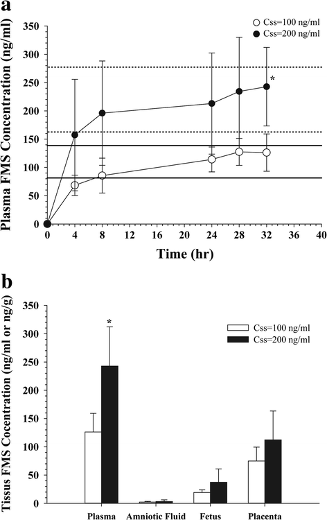 摘要:非马沙坦(FMS)是有效的血管紧张素受体拮抗剂,用于治疗轻度至中度高血压。本研究旨在评价FMS对大鼠胎儿和母乳的转运的影响。方法:为了研究FMS如何转移给胎儿及如何母乳转运,孕期和哺乳期大鼠采用持续静脉滴注FMS给药,使血浆浓度达到200ng/ml和100ng/ml。用高效液相色谱-质谱联用技术测定血浆、胎盘、羊水、胎儿和乳汁中的FMS浓度。结果:持续静脉输注,24h内血浆浓度达到目标稳态浓度(CSS=200ng/ml和100ng/ml)。根据组织和CSS中观察到的FMS浓度,获得胎盘、羊水和乳汁的组织-血浆分配系数(KP)。高剂量组(CSS=200 ng/ml)和低剂量组(CSS=100 ng/ml)所有组织的KP值之间的差异不显著。胎盘的平均Kp为44.6 - 59%,羊水的平均Kp为1.3 - 1.7%,胎儿为14.9 - 17%。乳汁是10.4 - 15.2%。结论:与其他血管紧张素受体阻断剂相比,FMS的胎盘转移和乳汁分泌相对较低。关键词:母体胎儿转移 乳汁的分泌 高血压 血管紧张素受体拮抗剂 非马沙坦背景:高血压是妊娠期最常见的医疗问题之一,影响6~8%的孕妇。尽管许多高血压孕妇有健康的婴儿,没有严重的问题,但高血压可能增加母亲和围产期风险。例如,母亲患上先兆子痫,这可能会影响胎盘以及母亲的肾脏、肝脏和大脑,并导致胎儿并发症,如低体重和早产。在最严重的情况下,先兆子痫可进展为抽搐和危及生命。然而,孕妇用药物治疗可能会引起各种发育毒性。一些降低血压的药物在怀孕期间被认为是安全的。然而,一些最有效的抗高血压药物,如血管紧张素转换酶(ACE)抑制剂和血管紧张素受体阻滞剂(ARBs)通常避免在怀孕期间使用。例如,氯沙坦已被FDA指定为妊娠D类,这意味着根据不良反应数据,有确凿的证据证明其对人类胎儿的发育有影响。与ACE抑制剂和ARBs相关的胎儿毒性同血管紧张素Ⅱ的降低与胎儿发育过程中肾素-血管紧张素系统的功能失调有关。ACE抑制剂可引起胎儿毒性包括严重的肾功能不全、新生儿无尿,颅骨骨化缺陷,胎儿生长迟缓,死胎,畸形特征。宫内暴露于药胎儿或新生儿毒性的证据,肾功能不全与ARB的使用物已经显示降低胎儿体重,引起肾功能损害,甚至导致胎儿死亡。除了药物本身的毒性作用外,药物的分布特征直接关系到胎儿和新生儿的安全。药物在胎儿和母乳中的大量分布是导致胎儿和新生儿毒性的重要因素之一,而较少的分布会导致毒性降低。胎盘转移和乳汁的排泄是ARBs的特征。FMS在胎儿或母乳中的分布尚不清楚,是评价其在妊娠和哺乳中安全性的关键。本研究对妊娠和哺乳期大鼠的胎盘转移和乳汁分泌进行了检测。静脉输液后,对胎盘、羊水、胎儿和乳汁中FMS的药动学进行了评价。方法:动物试验:雌性SD大鼠(8-10周龄,体重250-330 g),12小时的光/暗周期动物设施,温度23±3°C,相对湿度55±15%,每小时换气10-20次。每笼饲养3只动物。FMS的母婴转移:妊娠16-17天(GD)时,胎儿的大小足够用于分析,舒泰50(20毫克/公斤)腹腔注射麻醉雌性大鼠,将聚乙烯管材植入颈内静脉和股动脉。恢复1天后,FMS溶于生理盐水经颈静脉注射,剂量为2.70和5.50毫克/公斤,速率分别为0.17和0.34毫克/小时/公斤,达到目标浓度100和200纳克/毫升。初始静脉推注负荷剂量和持续静脉输注速率分别通过目标稳态浓度(CSS)乘以稳态分布体积和FMS清除率确定。无麻醉条件下给药。术前、术后4, 8, 24小时、28小时、32小时从股动脉取血。在每个采样时间,收集约0.3毫升的血液与同体积肝素化生理盐水(50 IU /毫升)混合。13000 g离心5 min,并存储在-20°C直到血浆样品分析。开始静脉输注药品后32h,舒泰静脉注射(2 mg/kg)麻醉动物后,颈椎脱臼法处死动物,每一个组织三个样品,如胎盘、羊水、和胎儿。胎盘和胎儿加入生理盐水后用均质机均质。样品存放在?20°C直到分析。24-32hde FMS的平均浓度表示稳态血浆浓度. 通过稳态等离子体FMS浓度除以32小时的平均组织FMS浓度计算组织-血浆分配系数(KP)。乳汁分泌中的FMS:在泌乳中期期间,哺乳期的第12-13天(LD),雌性大鼠腹腔注射舒泰50(20 mg/kg)麻醉状态下,颈内静脉与股动脉植入聚乙烯管。恢复1天后,FMS溶于生理盐水经颈静脉注射,剂量为2.70和5.50毫克/公斤,速率分别为0.17和0.34毫克/小时/公斤,达到目标浓度100和200纳克/毫升。在非禁食状态下给予剂量。在给药前和4, 8, 24、28、32小时后收集血样。在持续静脉输注32小时后,舒泰50, 2 mg/kg,静脉注射轻度麻醉状态下取乳汁。在乳汁取样前30分钟皮下注射催产素5 IU,以便于乳汁的收集。用手轻轻拔出乳头刺激乳汁排出,并在聚丙烯管内收集乳汁。样品存放在?20°C直到分析。24-32hde FMS的平均浓度表示稳态血浆浓度. 乳汁的KP计算为32小时乳汁中浓度超过血浆FMS浓度。液相色谱-质谱联用测定FMS的浓度:通过先前报道的LC-MS/MS法来测定生物样品中FMS的浓度。200μL乙腈和50μL的内标溶液被添加到50μl解冻的生物样品,漩涡混合1分钟。混合样品在4°C,15000G离心10 min. 将上清液转移到聚丙烯管中,用相同体积的蒸馏水稀释。在LC-MS/MS中注入10uL体积液体。结果:液相色谱-质谱联用测定FMS:血浆、胎盘、羊水、胎儿和乳基质中检测的下限为0.5纳克/毫升。血浆中的准确率为94.2 - 117.9%,胎盘中的89.2 - 111%,羊水中的87.7 - 116.9%,胎儿的89 - 110.7%,乳汁中的88.8 - 109.5%。血浆、胎盘、羊水、胎儿、乳样精度分别为8、12.3、3.8、10.4和8.5%。FMS的胎盘转移:对妊娠期大鼠血浆中FMS稳态浓度(CSS)为100和200 ng/ml时,平均血浆和组织FMS浓度随