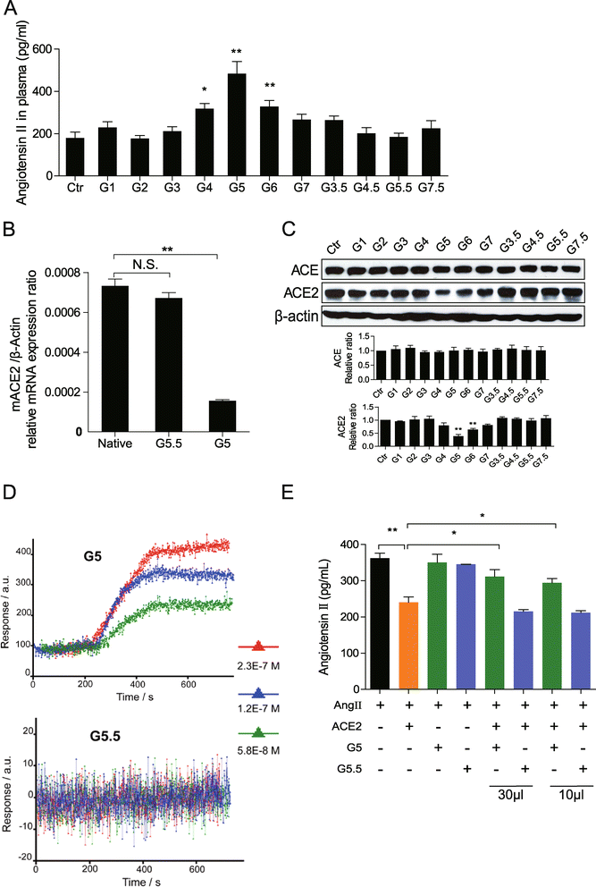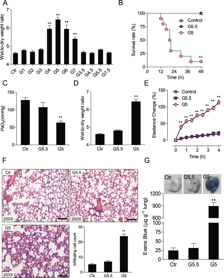 摘要:纳米颗粒已成为多个行业的关键技术。然而,越来越多的报告表明纳米材料对人类的毒性。特别是纳米材料已与肺部疾病联系在一起。纳米粒子毒性的分子机制在很大程度上未被探索。方法:通过阳离子聚酰胺-胺(PAMAM)纳米粒子的气管内滴注对野生型小鼠和血管紧张素转换酶2(ACE2)基因敲除小鼠诱发急性肺损伤。在纳米粒给药前30分钟腹腔注射氯沙坦(15 mg/kg)。结果:一些PAMAM纳米颗粒,但不是阴离子PAMAM纳米颗粒和碳纳米管对小鼠引发急性肺衰竭。阳离子纳米粒可以直接绑定ACE2,降低其活性,下调肺组织中的表达水平,从而导致肾素-血管紧张素系统放松。ACE2基因的失活可加重肺损伤。氯沙坦是一种血管紧张素II受体拮抗剂,可以改善PAMAM纳米颗粒诱导的肺损伤。结论:我们提供PAMAM纳米颗粒诱导的肺损伤数据,提出潜在的治疗和筛选策略以应对纳米材料的安全问题。关键词:纳米颗粒 血管紧张素Ⅱ 转换酶2 急性肺损伤 氯沙坦背景:纳米颗粒已经成为医药、信息和通信以及其他需要高强度轻质材料的领域的关键材料。人们对纳米粒子广泛使用的安全性提出了一些担忧。在这些问题中,纳米粒子对人类的潜在毒性是最令人痛心的。纳米材料在细胞、亚细胞和蛋白质水平上是有害的,它们被发现在各种生物体中引起有害反应。以前的报告表明,PAMAM树形分子是有毒的,其毒性受大小和表面电荷影响。纳米颗粒的电荷也能影响PAMAM树状大分子的毒性。PAMAM树枝状大分子已经证明启动血液凝块的形成和破坏血小板功能。虽然全身及口腔PAMAM纳米颗粒的毒性已经进行了研究,很少有集中在PAMAM纳米颗粒呼吸系统的安全性研究。考虑到PAMAM纳米颗粒的潜在的生物医学应用,特别是在肺部疾病中的应用,调查体内PAMAM诱导的肺损伤的潜在分子机制是十分重要的。方法:动物:所有小鼠都有C57BL/6 J背景。ACE2基因敲除小鼠。C57BL / 6 J小鼠购自北京Vital Rive。所有小鼠均为4~6周龄。所有的动物实验都是在中国协和医科大学基础医学研究所的动物设施中进行的,根据当地和机构的指导方针。诱导肺损伤:小鼠气管内滴注纳米颗粒浓度15μg/g诱导肺损伤。在纳米粒给药前30分钟腹腔注射氯沙坦(15 mg/kg)。急性毒性试验:48只雄性小鼠随机分为六组,每组六只,随机分为对照组和G5 PAMAM纳米颗粒。PBS组为对照组。II组,III,IV,V和VI的小鼠气管内分别注射7.35、10.5、15、21.43、30.61μg/g浓度的G5 PAMAM纳米颗粒. 给药后观察动物48小时,记录死亡率。LD50值(95% CI)采用改进的卡伯法计算。LD50为11.22μg/g和95%置信限度为9.89-12.74μg/g。肺水肿的评估:在评估肺水肿程度前10小时小鼠气管内注入浓度为15μg/g纳米粒子,计算肺湿干重比值。从切除的肺中排出血液后,测量了肺的湿重。然后将肺加热到68°C,在烤箱中加热24小时,测量肺的基线干重量。生存率:小鼠气管内注射赋形剂或纳米颗粒(15μg / g). 记录每组48小时的存活率,用Kaplan Meier生存曲线绘制。纳米粒子滴注前30分钟腹腔注射氯沙坦。血氧测定:小鼠气管内注入浓度为15μg/g纳米粒子。10h后,从颈总动脉取血,测定动脉血氧分压评估动脉血氧,作为评估呼吸衰竭的一个指标。肺顺应性:小鼠戊巴比妥钠麻醉,然后是赋形剂(对照组)或纳米颗粒(15μg/g)溶解在同一赋形剂中进行气管内给药。自主呼吸阶段每30分钟通过buxco肺功能测试肺顺应性,连续4小时。组织病理学:给药十小时(15μg/g)后处死小鼠,测定其体重。从胸腔中取出肺,放入一个约50毫升固定液的玻璃瓶中。肺在福尔马林中固定液中至少固定48小时,石蜡包埋,切片,HE染色后镜检。肺血管通透性:在诱导肺损伤后,通过测量伊万斯蓝肺渗漏来评估肺血管通透性。纳米颗粒的气管内注射10小时后尾静脉注射伊万斯蓝(20μg/g)。十分钟后处死动物,取出肺脏,用冷PBS灌注右心室。然后将肺组织浸入甲酰胺中,分析测定伊万斯蓝含量。采用分光光度计620nm波长读取伊文思蓝甲酰胺溶液OD值。建立了标准浓度回归曲线,用于测定肺组织中伊万斯蓝的含量。血管紧张素II肽水平:小鼠气管内注射纳米颗粒(15μg/g)3小时后取血置入1.5毫升含肽酶抑制剂混合物的管内。放射免疫法测定血浆血管紧张素肽。结果:G5 PAMAM纳米颗粒诱导的小鼠急性肺损伤:为确定PAMAMs能诱导小鼠肺损伤,我们在小鼠体内测试了不同PAMAMs经气管内给药(15μg/g)的方法。G4、G5、G6和G7PAMAM树枝状大分子引起严重的肺损伤,通过增加湿干重比得到证明,这是衡量肺水肿和炎症的指标。高代PAMAM纳米阳离子在肺部引起的严重损伤,而低代PAMAM树状大分子与羧基终端聚合物无急性毒性。因为G5 PAMAM纳米颗粒(直径约为5 nm)具有严重的急性肺损伤,我们专注于后续G5 PAMAM纳米颗粒实验。在体内还测试了G5PAMAM纳米颗粒的急性毒性;结果表明,G5 PAMAM纳米的LD50为11.22μg/g和95%置信界限为9.89-12.74μg/g. 我们首先检测了树枝状大分子G5 PAMAM肺部给药后小鼠的生存率。G5 PAMAM纳米颗粒给药的所有的小鼠几乎均在48小时内死亡,而对照组及阴离子G5.5 PAMAM树枝状大分子小鼠存活。死亡原因是肺损伤的迅速发展,其特点是血氧减少、增加肺组织湿干重比和大规模的弹性改变。肺顺应性是一个测量肺功能方法,单位体积内压力的变化,表明肺的刚度。G5 PAMAM肺组织病理显示出血增加和炎性细胞浸润。G5 PAMAM给药导致血管通透性增加、急性肺损伤和呼吸窘迫综合征。这些结果表明G5 PAMAM纳米粒子吸入