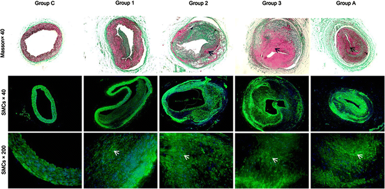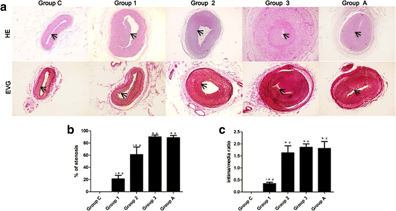 摘要:再狭窄仍然是糖尿病周围血管疾病(PVD)患者经皮腔内血管成形术(PTA)的主要限制因素。尽管采取了防止这种进展的常规措施,但其确切效果尚不清楚。方法和结果:本实验成功地将球囊移植于动脉粥样硬化兔髂动脉内。超声检查狭窄动脉的通畅情况。在双损伤手术后第0天至第28天给予兔阿托伐他汀或赋形剂口服给药。第7天,14天,和28天,获取再狭窄的动脉进行组织学分析。我们的数据表明,双损伤手术后,所有兔子内膜的组成主要是平滑肌细胞(SMCs)。从第7天到第14天,狭窄率显著增加(从21±5.85 %到 60.93±12.46 %)。双损伤术后28天,观察到严重的再狭窄,阿托伐他汀不能预防再狭窄的形成(88.69±3.71% vs. 90.02±3.11%)。PCNA指数同平滑肌细胞增殖与血管病变评分相关。结论:结果表明,双损伤模型可以模拟临床再狭窄,在此基础上,阿托伐他汀对糖尿病兔PTA再狭窄过程无明显影响。关键词:阿托伐他汀 再狭窄 经皮腔内血管成形术 周围血管疾病 糖尿病背景:经皮腔内血管成形术(PTA)由于其初期成功率高,广泛应用于糖尿病周围血管疾病(PVD)。但一年内多达70%个病人发生再狭窄,成为此临床应用的局限性。试图通过抗血小板药物、糖皮质激素和钙通道阻滞剂来预防或减少再狭窄,都有药物不良反应。缺乏实际的再狭窄模型限制了研究潜在治疗的可能性。安装血管成形术狭窄动物模型已被用来研究药理学和机械方法。在大多数研究中,在正常的动脉血管成形术球囊过度开发重现PTA人血管反应方面(单损伤模型)这是建立动脉粥样硬化模型,而不是再狭窄模型。因此,建立可靠的动物模型,以研究潜在的治疗方法,以防止PVD患者发生PTA再狭窄是非常重要的。他汀类药物,一类羟甲基戊二酸单酰辅酶A(HMG-CoA)-(CoA)还原酶抑制剂,具有抗炎和抗增殖特性。既往研究表明,他汀类药物可减轻球囊损伤动物模型的炎症反应和动脉内膜增生。由于这些原因,临床上作为PTA患者的常规治疗以抑制再狭窄的发生。然而,在我们的日常工作中,我们发现他汀类药物对再狭窄抑制的临床效果是次要的。本实验建立了新西兰白兔的双损伤再狭窄模型,模拟PTA高血糖后髂动脉再狭窄的增殖过程。阿托伐他汀是最广泛使用的他汀类药物。因此,在这项研究中,阿托伐他汀被用来检测他汀类药物对抑制再狭窄的作用。通过使用这种动物模型,我们旨在研究糖尿病患者应用PVD治疗后再狭窄的潜在治疗方法,或了解再狭窄过程本身的机制。方法:动物:雄性新西兰白兔(1.7公斤)。兔子被单独安置在标准的兔笼和保持在12:12-明:暗周期。试验开始前一周给予引起动脉粥样化饮食(1 %胆固醇)直到饲喂至动物死亡。在研究过程中,所有的兔子都可以自由采食和饮水。试验方案:实验性糖尿病的诱导:禁食一晚后,80mg/kg的新鲜制备的四氧嘧啶溶液从兔耳缘静脉注射。动物在四氧嘧啶注射后可自由获取食物和水,经确认低血糖后,口服20%葡萄糖溶液预防低血糖休克。在四氧嘧啶注射一周后测定血糖,血糖水平大于300mg/dl的动物被认为是糖尿病患者,并用于试验。双损伤手术方法:(1)球囊诱导内皮损伤手术诱导动脉粥样硬化斑块形成。糖尿病诱导一周后,用苯巴比妥麻醉家兔。使用标准外科手术开展正确的隐动脉切开术,插入一个2.5mm线导球囊导管,按照先前描述的方法损伤髂动脉。经超声证实,第一次手术后4周左右髂动脉出现严重动脉粥样硬化损伤。(2)然后是进行PTA诱导再狭窄斑块。经右股动脉远端解剖,球囊导管插入损伤的髂内动脉,并在第一损伤部位施行PTA。在上述治疗后,彩色多普勒显示动脉硬化性髂动脉的通畅。成功的双重损伤手术引起的再狭窄模型,随机分为四组:7天再狭窄组(1组,n = 6)14天再狭窄组(2组,n = 6);28天再狭窄组(3组,n = 6)和28天阿托伐他汀治疗组(A组,n = 6)。阿托伐他汀的剂量(2.5mg/kg/d)。阿托伐他汀口服灌胃治疗于双损伤手术当天开始。六只假手术糖尿病兔施行相同的外科手术,除未插入球囊外,对照组(c组)。获取组织与形态分析:在每一个时间点(双损伤手术7, 14,28天后),(A组和C组动物在第28天)处死动物。采集耳血标本,检测血清总胆固醇、甘油三酯、低密度脂蛋白和高密度脂蛋白胆固醇水平。获取损伤的髂动脉段,固定在4%甲醛中,石蜡包埋切成5um的切片。HE染色观察一般形态,马松三色染色胶原、平滑肌细胞(SMC)。应用图像分析软件进行了内膜生长的形态计量学分析。内膜生长是由内膜面积与内部弹性层(管腔横截面积变窄)区域比值和内膜与内侧面积比值来估计的。免疫组化分析:石蜡组织切片,脱蜡,梯度乙醇水化。用EDTA缓冲液(10 mM Tris, 1 mM EDTA, 0.05 % Tween 20, pH 9.0)在微波炉中进行20min的热诱导抗原回收。切片冷却后用3%双氧水孵育。用含5%山羊血清的PBS阻断后,切片在4°C,用一抗孵育过夜。PBS洗涤后,切片在37°C时用二抗孵育30分钟。阳性反应的可视化是通过过氧化物酶底物溶液,PBS中含有0.02%(重量/体积)H2O2和0.1%(重量/体积)3,3 -二氨基联苯胺盐酸盐,产生褐色,切片用苏木精复染。阴性控制,用小鼠IgG抗体替代原代抗体。抗增殖细胞核抗原(PCNA)抗体,1:400稀释,被使用来确定细胞增殖。对PCNA阳性细胞进行计数。根据以下公式计算PCNA指数:PCNA阳性细胞数/总细胞计数×100%。免疫荧光染色:免疫荧光染色。简单地说,3%过氧化氢孵育抑制内源过氧化物酶活性,用5%(v/v)山羊血清封闭1小时。用PBS洗涤后,切片与FITC标记的平滑