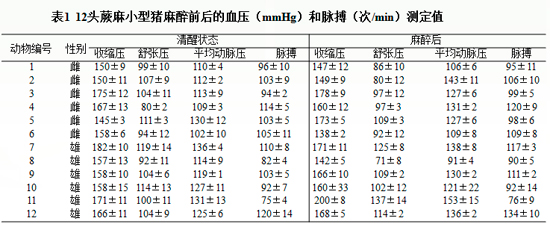 1.2.2 麻醉状态下蕨麻小型猪血压、脉搏测定方法 用盐酸氯胺酮注射液按照10 mg/kg.bw和噻拉嗪注射液1 mg/kg.bw混合液的剂量对蕨麻小型猪于耳后根颈部注射,待蕨麻小型猪完全麻醉3~5 min后,放置在四孔保定架上,四肢垂在孔下,将监护仪充气囊套在待测猪左前肢,开机后最少连续测量4次以上血压,要求4次血压相互间MAP的差值在20 mmHg之内,然后选用相互间差值在20 mmHg之内的血压值,包括收缩压、舒张压、平均动脉压和脉搏。