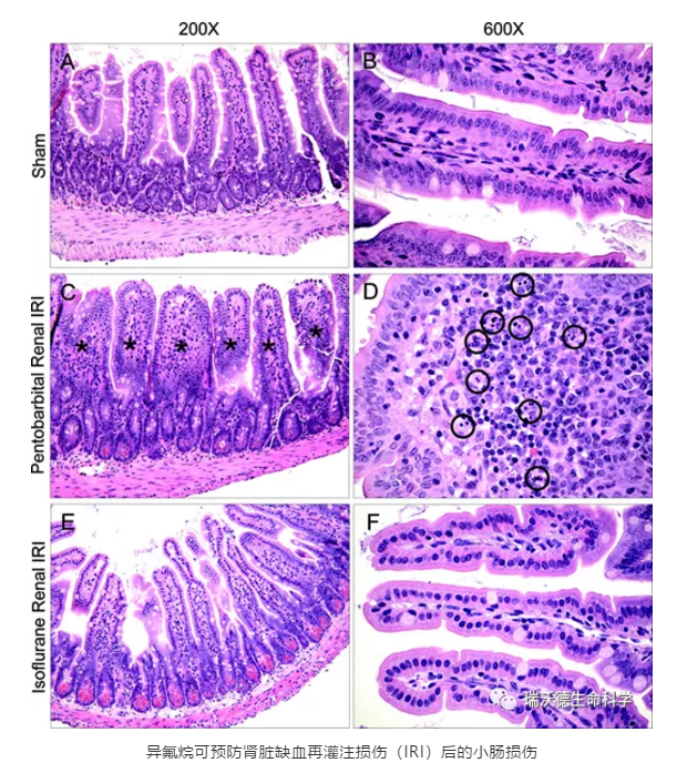 图示表明肾脏IRI后,戊巴比妥暴露导致明显的肝细胞空泡化、小肠中上皮绒毛肿胀和凋亡。异氟烷暴露显著减轻了肝脏和小肠的损伤。 与戊巴比妥相比,吸入式麻醉剂不会显著改变全身血压或肾血流量。某些吸入式麻醉剂(例如甲氧基氟烷)会因为无机氟化物而发生肾脏代谢,并有直接的肾毒性。但异氟烷代谢少,与氟化物的肾毒性无关。