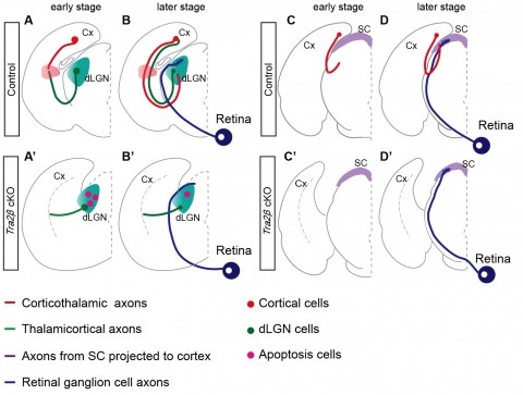 研究发现视皮层和背部外膝体间的相互连接是介导视网膜到外膝体投射的关键因素,Tra2b条件性敲除小鼠(Tra2b-flox;Emx1-Cre)在发育早期表现出明显的皮层缺失现象,成年后小鼠的大部分皮层和海马都消失。研究表明,Tra2b条件性敲除小鼠的视网膜到背部外膝体的投射在E18.5出现明显的缺陷,视皮层和背部外膝体间的连接消失,同时在外膝体中和背部外膝体到视皮层的通路上均发现细胞凋亡的现象。在体电生理实验显示,Tra2b条件性敲除小鼠的背部外膝体细胞不具有光反应,确定视网膜到背部外膝体投射的缺陷。通过go-no go的行为实验,我们发现Tra2b条件性敲除小鼠对方向性视觉线索的判断能力比正常小鼠差,提示视网膜到背部外膝体的投射发生缺陷后,小鼠的视觉能力受到影响。为证实视皮层和外膝体间的连接影响视网膜到背部外膝体的投射,我们进一步利用化学损伤和另一条件性敲除小鼠(Fezf2-flox;Emx1-Cre)模型,确定了视网膜到背部外膝体的投射依赖于视网膜和背部外膝体间的连接。有意思的是,在三个小鼠模型中,视网膜到腹侧外膝体和上丘的投射都正常,这是由于腹侧外膝体和上丘都不和视皮层发生直接的投射关系。该研究为视网膜-外膝体-视皮层环路的协调性发育提供了启示性的证据。