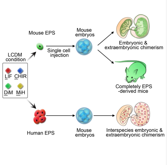 邓宏魁研究组通过化学小分子筛选,开发了一种全新的培养体系,能够建立具有胚内和胚外发育潜能的小鼠和人干细胞系。这一全新的干细胞被命名为潜能扩展的多能干细胞(Extended Pluripotent Stem Cells),简称为 EPS 细胞。令人惊奇的是,单个小鼠 EPS 细胞即可高效地嵌合到小鼠不同发育时期的胚内和胚外组织中,并发育形成各种胚内和胚外的组织类型。通过四倍体补偿技术,进一步证明了单个小鼠 EPS 细胞即能发育成为成体小鼠。该研究组还利用人鼠异种嵌合技术,分析了人 EPS 细胞的体内发育潜能。人 EPS 细胞注射到早期小鼠胚胎后,能够稳定地嵌合到小鼠胚内和胚外组织中,其胚内整合比例比已报道的整合效率提高了近 20 倍,并在 mRNA 和蛋白水平证明了人嵌合细胞能够向不同的细胞谱系分化。上述结果表明 EPS 细胞同时具有胚内和胚外的发育潜能。