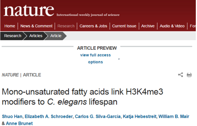 Brunet 说:“接下来,我们想知道,是否这种单不饱和脂肪的积累对寿命是重要的。所以,我们直接给线虫分别喂食了单不饱和脂肪和多不饱和脂肪。”结果发现,即便当 COMPASS 没有突变时,单不饱和脂肪也能够在线虫肠道中积累,并延长它们的寿命。相比之下,多不饱和脂肪没有起到同样的效果。