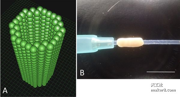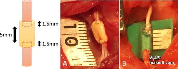 A:预先设计好的3D管状结构 B:根据A制作的3D打印导管据天工社了解,作为替代解决方案,Ikeguchi的研究团队测试了3D打印导管的功效。他们将正常人的皮肤成纤维细胞作为基础材料,用高性能3D生物打印机制造出无支架的导管作为神经组织。在实验过程中,研究人员在十二只成年雄性老鼠身上测试了这些3D打印导管的适应性。为了研究3D打印导管在再生神经组织和节段中的效果,他们收集了有免疫缺陷的老鼠,这些老鼠右侧坐骨神经的大腿中部处被切断。在一个与自体神经移植类似的过程中,研究人员用3D打印导管来连接老鼠的病变间隙。