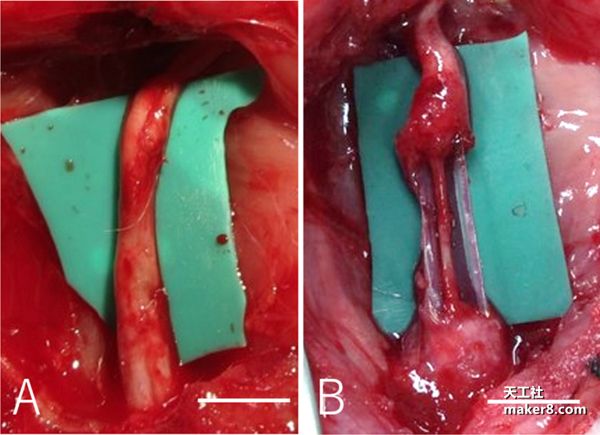 A:使用3D打印导管的老鼠的神经再生情况 B:使用硅胶导管的老鼠的神经再生情况