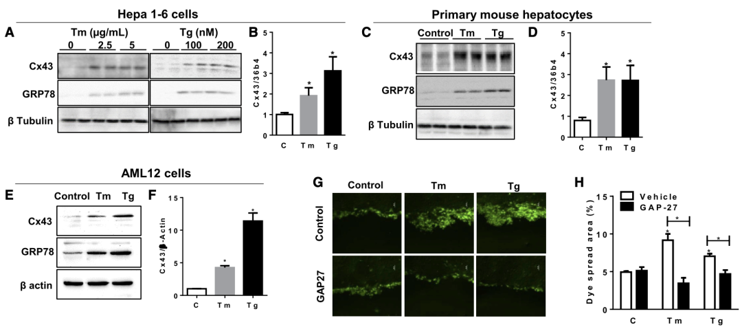 首先,研究人员评估了ERS对肝细胞系和分离的原代小鼠肝细胞中Cx43表达的直接影响,发现化学诱导ER应激可使Cx43水平升高。并且,内质网应激可增加GJ介导的细胞-细胞通讯。