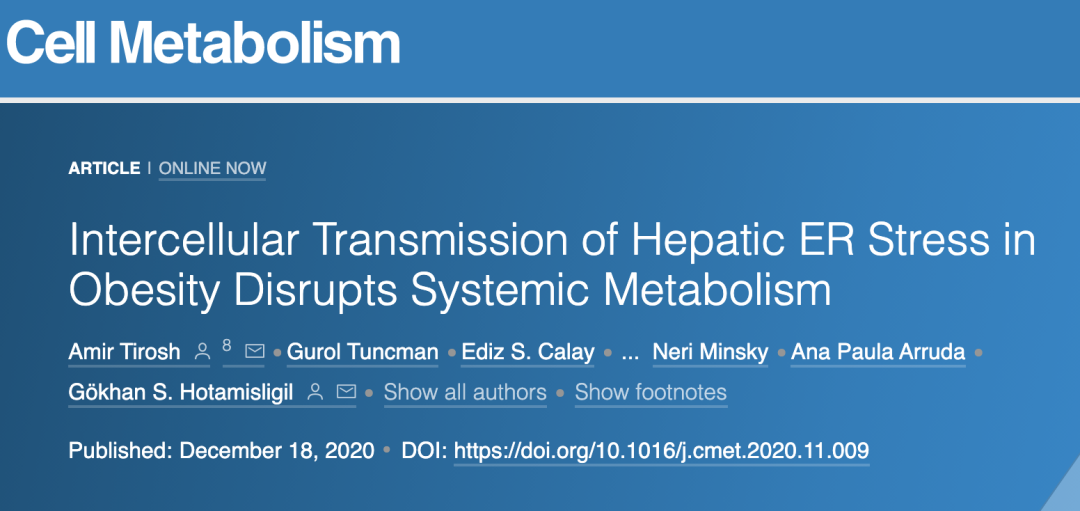 近日,《Cell Metabolism》在线发表了哈佛大学公共卫生学院Gkhan S. Hotamisligil团队名为“Intercellular Transmission of Hepatic ER Stress in Obesity Disrupts Systemic Metabolism”的研究。该研究表明,营养过剩会加剧组织的内质网应激,并通过细胞通讯传递到临近细胞,促进肝脂肪变性、损害了全身葡萄糖代谢。