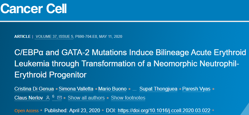 Di Genua et al.,2020.C/EBPαand GATA-2 Mutations Induce Bilineage Acute Erythroid Leukemia through Transformation of a Neomorphic Neutrophil-Erythroid Progenitor.Cancer Cell 37,690–704.