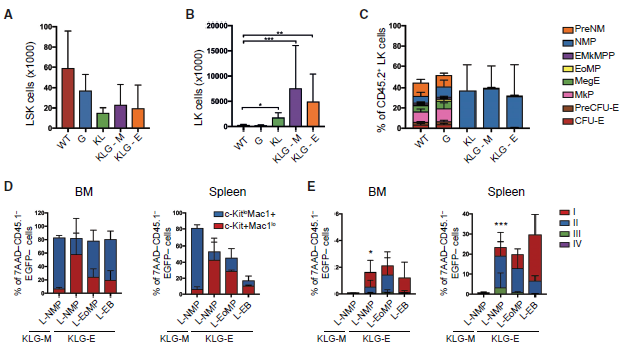 濒死的小鼠出现白细胞增多、红细胞减少、血小板减少以及脾脏肿大的特征(图1)。研究人员在检查小鼠的血液涂片后发现,部分KLG小鼠(5/13)的外周血中同时存在髓系和红系母细胞(KLG-E小鼠),而其余的小鼠只存在髓系母细胞(KLG-M小鼠)。对比这两种小鼠的生存率,他们发现KLG-E小鼠的白血病进展更快。