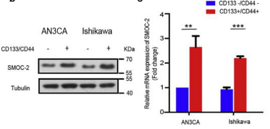 为了确定SMOC-2与肿瘤干细胞之间的关联,作者通过流式分别分选出的人子宫内膜癌细胞系AN3CA和Ishikawa的CD133+/CD44+细胞以及CD133-/CD44-细胞(CD133和CD44已经被广泛地认为是多种类型癌症中的肿瘤干细胞的表面标志物),经Western blot及qPCR验证,SMOC-2在CD133+/CD44+中的表达显著高于CD133-/CD44-细胞,提示了SMOC-2与肿瘤干细胞相关。