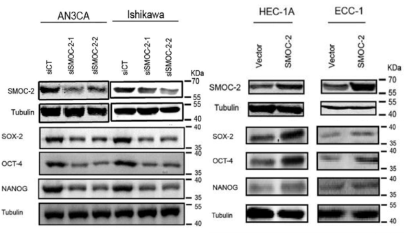 SMOC-2是SPARC家族成员之一,在胚胎发生和伤口愈合过程中高度表达。该基因产物是一种基质细胞蛋白,可刺激内皮细胞增殖和迁移,以及血管生成活性。已有研究表明,SMOC-2可能在性腺和生殖道发育过程中介导细胞间信号转导和细胞类型特异性分化。此外,SMOC-2已被证明是肠道干细胞的特征基因且对于L1介导的肠癌发展是必需的。因此作者想探索SMOC-2是否与子宫内膜癌肿瘤干细胞之间存在关联。