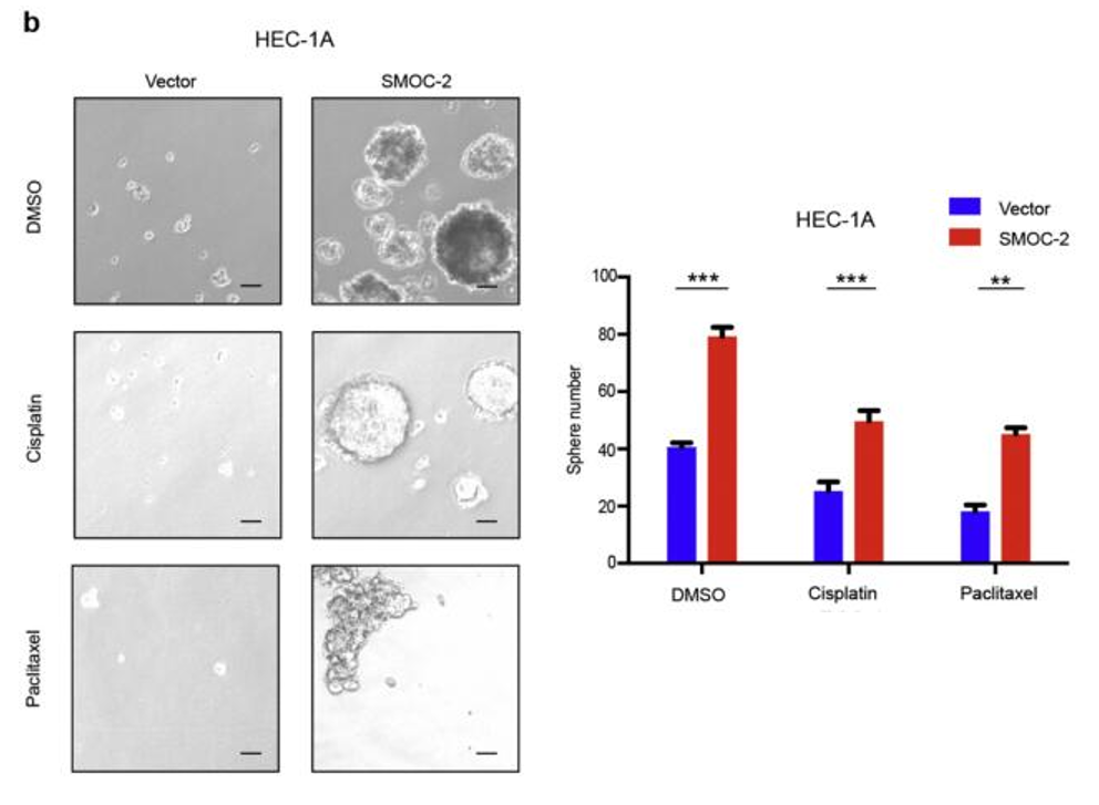 由于肿瘤干细胞具有抵抗化疗的能力,因此作者通过成球实验评估了SMOC-2在癌细胞抵抗化疗药物(如顺铂Cisplatin和紫杉醇Paclitaxel)中的作用,发现了SMOC-2过表达的癌细胞能够显著抵抗顺铂以及紫杉醇对于癌细胞生长抑制的影响。证明了SMOC-2介导了子宫内膜癌的化疗抵抗。