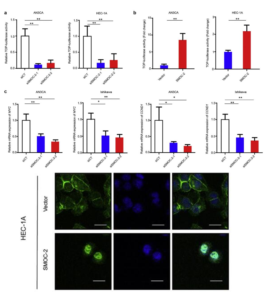 在验证了SMOC-2的促癌功能之后,作者接下来研究其作用机制,由于Wnt通路、Hedgehog通路和Notch通路等发育相关的通路在肿瘤干细胞中发挥着重要的作用。作者通过荧光素酶报告基因实验发现Wnt信号通路活性在SMOC-2敲低后被抑制,而在SMOC-2过表达后则显著提高,而其他通路则无影响。此外,Wnt通路的靶基因MYC以及CCND1在SMOC-2被敲低后也发生了下调。最后,作者通过免疫荧光实验证明了Wnt通路中的关键转录因子β-catenin在SMOC-2过表达子宫内膜癌细胞系中从细胞质中易位入核,促进靶基因的转录。综上所述,作者通过荧光素酶报告基因实验,通路靶基因的表达和转录因子的免疫荧光实验三种方法证明了SMOC-2激活Wnt信号通路。