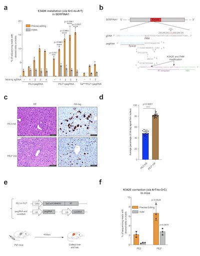 在此基础上,作者研究了升级版的PE2*在矫正遗传性疾病方面的作用。对此,作者使用了一个单基因突变的疾病模型进行验证。Alpha-1抗胰蛋白酶缺乏症(AATD)是由Serpin肽酶抑制剂家族A成员1(SERPINA1)基因突变引起的遗传性疾病。SERPINA1(PiZ等位基因)中的E342K突变(G到A)是最常见的突变,该突变会导致严重的肺脏和肝脏疾病。细胞培养实验证明, PE2 *的碱基矫正比例为6.4–15.8%,而PE2仅为1.9–9.9%。总的来说,PE2*相比PE2的基因矫正能力提高了1.6到3.4倍。最后,作者还证明了该升级版的PE2*在活体中的基因编辑能力。结果显示,PE2*能够更加高效地改变小鼠中CTNNB1 (β-catenin) 的S45F突变(C-T),从而提高肿瘤发生的水平。而利用AAV传递,则可以起到纠正小鼠肝脏中致命性突变(SERPINA1蛋白E342K突变)的作用。