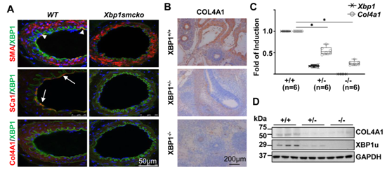 在这项研究中,明确血管平滑肌细胞XBP1s对COL4A1s的上游调控作用是后续开展机制研究的先决条件。为此作者构建了血管平滑肌细胞条件敲除XBP1的转基因小鼠,并在此基础上构建了股动脉导丝拉伤模型,通过免疫组化、免疫荧光等实验技术阐释了血管损伤对XBP1s、COL4A1及血管壁细胞组成的直观认识。考虑到XBP1全敲小鼠存在胚胎致死的特点,研究者将XBP1+/-小鼠交配产生的不同基因型胚胎作为另一种验证方式。最终,从在体水平证实了XBP1为COL4A1上游调控基因的研究线索,为后续深入开展XBP1s-COL4A1s信号通路调控血管损伤后新生内膜形成的机制研究奠定了基础。