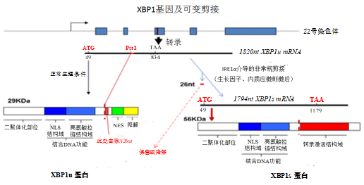 XBP1 mRNA是哺乳动物IRE1目前已知唯一的酶切底物。正常情况下,XBP1 mRNA可翻译产生一个261个氨基酸的非剪接型蛋白(XBP1 unsplicing isoform, XBP1u)。其具有一个N末端二聚体结构域、内部的碱性亮氨酸拉链结构域(bZIP)以及含有两个疏水区、核输出信号和蛋白酶体结合位点的C末端[4]。受到刺激后,XBP1u的翻译暂停,新转录的XBP1u mRNA在细胞质Sec61转运子辅助下,借助其HR2结构域与内质网结合。在激活的IRE1α和连接酶RtcB作用下,其中的26个核苷酸被去除,产生开放阅读框移位,最终产生一个376氨基酸的剪接后蛋白(XBP1 splicing isoform, XBP1s)[4]。XBP1s保留了N末端的二聚体结构域和内部bZIP结构域,C端出现反式激活结构域,形成一个完整的转录因子,负责应激反应后的转录调控。