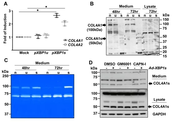 COL4A1和COL4A2共用一段启动子。RT-PCR表明过表达XBP1s可上调COL4A1和COL4A2 mRNA水平。过表达XBP1s后,在血管平滑肌细胞培养上清中检测到分子量更小(50kDa条带)的COL4A1条带,提示COL4A1可能发生了降解。酶谱分析表明过表达XBP1s确实增加了一些蛋白酶的分泌。但酶抑制剂并不能消除XBP1s诱导出的50kDa COL4A1条带,提示其并非蛋白酶降解而来。