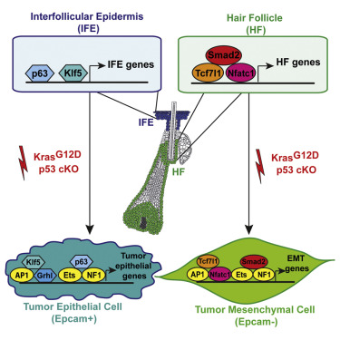 在这项新研究中研究人员利用基因工程小鼠对起源癌细胞进行谱系追踪,并检测表皮不同部位诱导癌症形成的突变基因的表达。令人惊讶的是,起源于毛囊的肿瘤通常都是会发生EMT过程并具有很强侵袭性的间充质样肿瘤,而起源于毛囊间表皮的皮肤癌是上皮高分化的癌症。这些数据表明,毛囊干细胞和它们的后代容易发生EMT过程并发生转移,说明起源癌细胞与肿瘤的侵袭性密切相关。