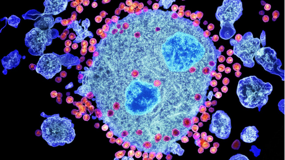 免疫细胞(蓝色)出芽生成艾滋病病毒颗粒(粉色)—一项猴的研究提出了一种新的抑制病毒的方法。