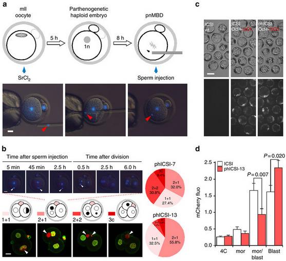 Anthony Perry及同事在胚胎首次分裂为两个细胞前,将精子细胞核注入了经过化学改造的小鼠胚胎。这些胚胎经过化学处理,只含有一组不配对的染色体,而不是精子和卵子融合通常会产生的一组配对染色体。产生的胚胎发育成了健康的个体(但其比例最高只有对照组的24%)。虽然作者并没有展示精子基因组是如何重编程的,但他们发现,经过改造的胚胎与对照组在染色体和DNA上有一定相似之处,然而在细胞运转方面也有所差异,这意味着二者重编程的路径不同。
