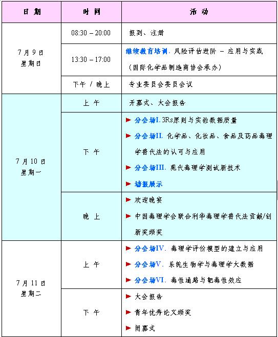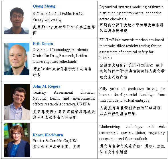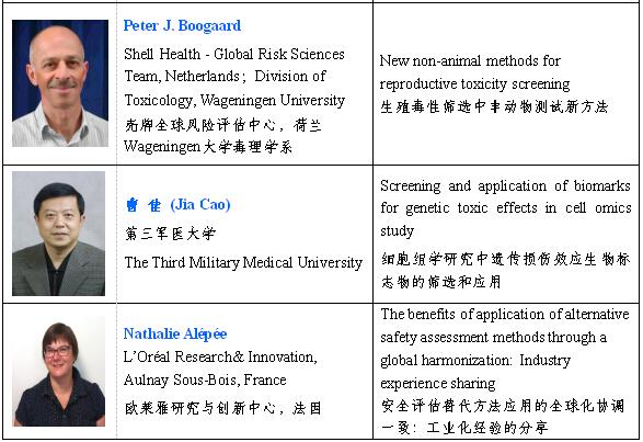 三、会议主要内容大会设主旨报告、大会报告、专题报告、壁报交流及培训班。主旨报告和大会报告将邀请美国、英国和日本等国内外毒性测试替代方法与转化毒理学领域的资深专家做报告。专题报告主要为国内外相关领域的中青年专家,同时还将开展“青年优秀论文奖”评选活动(1977年1月1日后出生的青年代表)。会议语言为中文或英文。会议征文内容主要包括(但不限于)以下主题。主题I.3Rs原则与实验数据质量3Rs原则的宣传与培训;伦理技术审查原则与实施;仁慈终点的选择与优化;动物实验替代技术;数据评价与质量控制;麻醉及无痛技术的发展;应激生物学与应激控制;基因修饰与转基因工程动物。主题II.化学品、化妆品、食品及药品毒理学替代法的认可与应用毒理学替代方法的构建;毒理学替代法的验证与认可;数据认可与法规管理;皮肤致敏反应评估新方法;生殖发育毒性评价;靶器官毒性评价;致癌性评价;生物新材料风险评价。主题III.现代毒理学测试新技术暴露科学及评估技术;毒物暴露与疾病风险的关联性研究;计算毒理学与毒性预测;高通量筛选;高内涵成像与分析;细胞3D培养;微流控技术。主题IV.毒理学评价模型的建立与应用化学物特征分析(QSAR模型等);毒作用剂量-效应评估模型;体内-体外数据外推(PBPK等);化学诱导疾病动物模型;干细胞及虚拟器官模型;体外代谢模型;数据交叉参比;毒理学关注阈值。主题V.系统生物学与毒理学大数据毒理“-组学”技术及应用;生物信息学及技术;AOP评估数据权重分析;毒性通路网路数据分析;数据整合与决策;毒理学数据库的应用;数据验证与互认。主题VI.毒性通路与靶毒性效应毒性通路的识别与描述;毒作用模式(MOA)与靶毒性效应;AOP的构建与应用;生物标志物;剂量-效应反应评估;细胞凋亡与自噬;氧化应激与炎症反应。四、部分已确定的学术报告