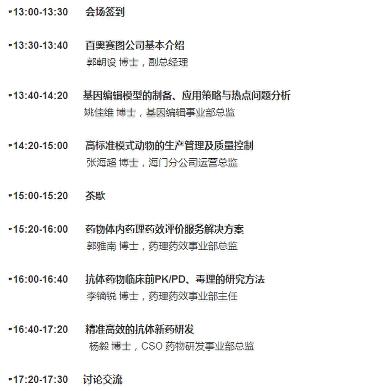 本次系列沙龙活动围绕1)基因编辑模式动物制备和应用, 2)模式动物大规模生产及供应,3)高效的体内外药理药效评价方法,4)精准抗体药物研发的创新模式展开分享和讨论,与各位专家学者共同探讨模式动物在抗体药物研发中的创新应用,以及新型抗体药物研发的机遇与挑战,共同开启药物研发创新新时代!