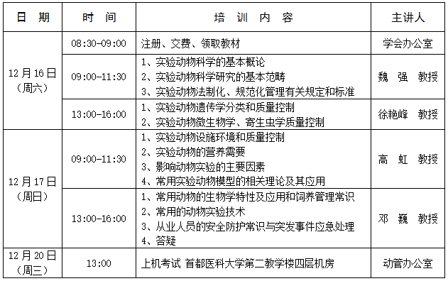 北京市实验动物从业人员上岗证培训班课程表