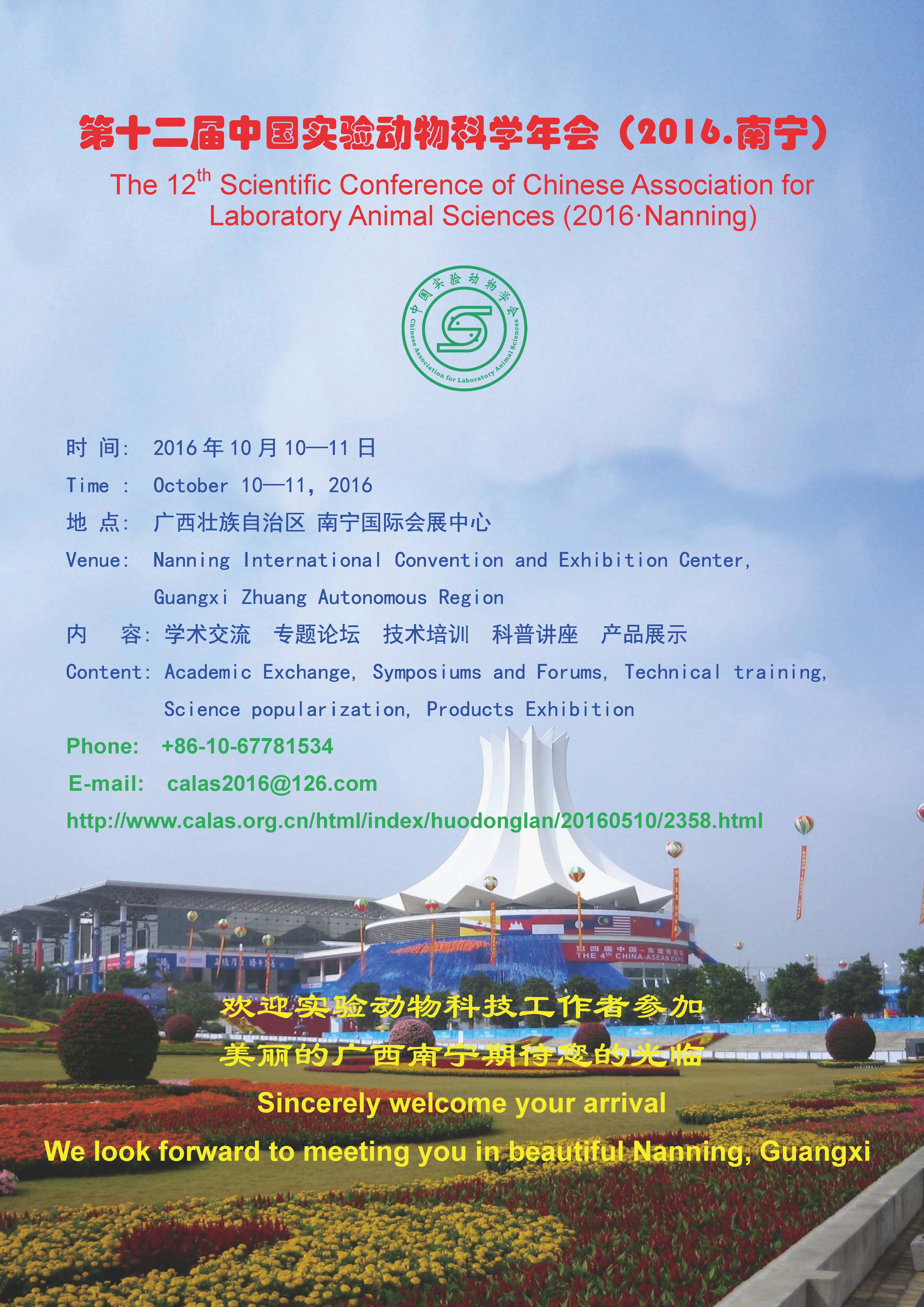目前,实验动物科学研究逐渐深入,新研究、新技术和学术成果不断涌现。为了与国际实验动物学发展同步,加强学科研究方法和技术的规范化、标准化,繁荣我国实验动物学科发展,由中国实验动物学会主办,广西实验动物学会承办,广西科学技术协会支持的“第十二届中国实验动物科学年会(2016.南宁)”将于2016年10月9—11日在广西南宁市举办。这是国内实验动物科学领域规模最大、水平最高的学术会议,为从事实验动物学、生命科学、医学领域的研究工作人员了解学科研究动态和最新进展、提高学术交流水平和不同学术思想融合提供了良好的平台,是广大实验动物科学、生命科学领域科技工作者相互交流、相互合作、共同提高的良好机会。