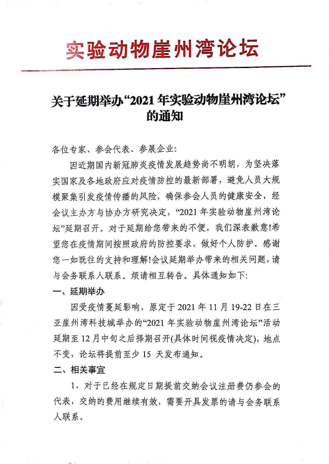 关于延期举办“2021年实验动物崖州湾论坛”的通知