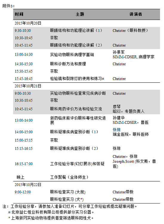 实验动物眼科诊断,涉及眼科解剖学,生理学,病理学和光学等多个技术交叉学科。眼科诊断不仅在新药安全性评价中具有举足轻重的作用,同时也在实验动物质量监控中具有重要意义。通过眼科诊断,可以发现药物眼科毒性,实验动物遗传突变眼科表观改变,并可作为眼科模型动物的筛选手段。 2015年10月20-22日,中国科学院上海药物研究所药物安全评价研究中心(SIMM-CDSER)、上海实验动物资源共享服务平台和上海市实验动物学会在上海共同举办“全国实验动物眼科诊断培训班”。本次培训将邀请在阿斯利康有30多年工作经验的瑞典眼科教授Christer进行实验动物眼科诊断的理论及实践操作。同时本次培训还将邀请到国内外多位眼科专家和大家共同探讨眼科诊断焦点问题。培训后颁发培训证书,期待大家的参加。1. 参加人员、人数 欢迎对实验动物眼科诊断感兴趣的兽医和眼科检查技术人员踊跃报名参加。为保证培训效果,本次培训班名额有限,按报名先后顺序为准。2. 培训日程 2015年10月20日-22日,参见附件3,具体见第二轮通知。3. 培训地点 SIMM-CDSER(浦东新区张江高科技园区海科路501号), 报名截止日期:2015年09月10日(回执见附件)。4.培训费用 人民币2000元/人,提供午餐,外省市人员住宿费用自理。5. 其它 请于2015年09月10日17:00前发回执到邮箱: jhsun@cdser.simm.ac.cn 联系人:上海药物研究所安评中心 李良顺 021-20231000-4022 孙建华 13482719835 上海市实验动物学会 王伟民 021-50793657中国科学院上海药物研究所上海市实验动物学会药物安全评价研究中心2015年07月27日