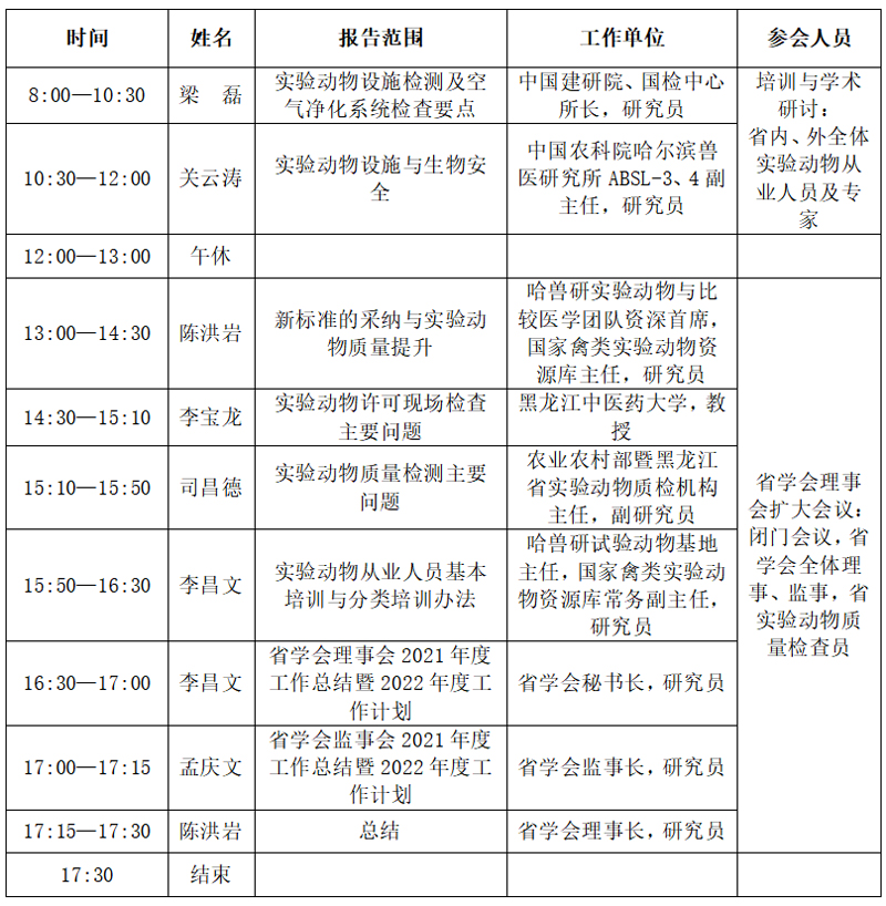 黑龙江省实验动物学会理事会、监事会成员,黑龙江省实验动物质量检查员及全体实验动物从业人员。欢迎全国实验动物学界相关专家及从业人员共同参会交流。