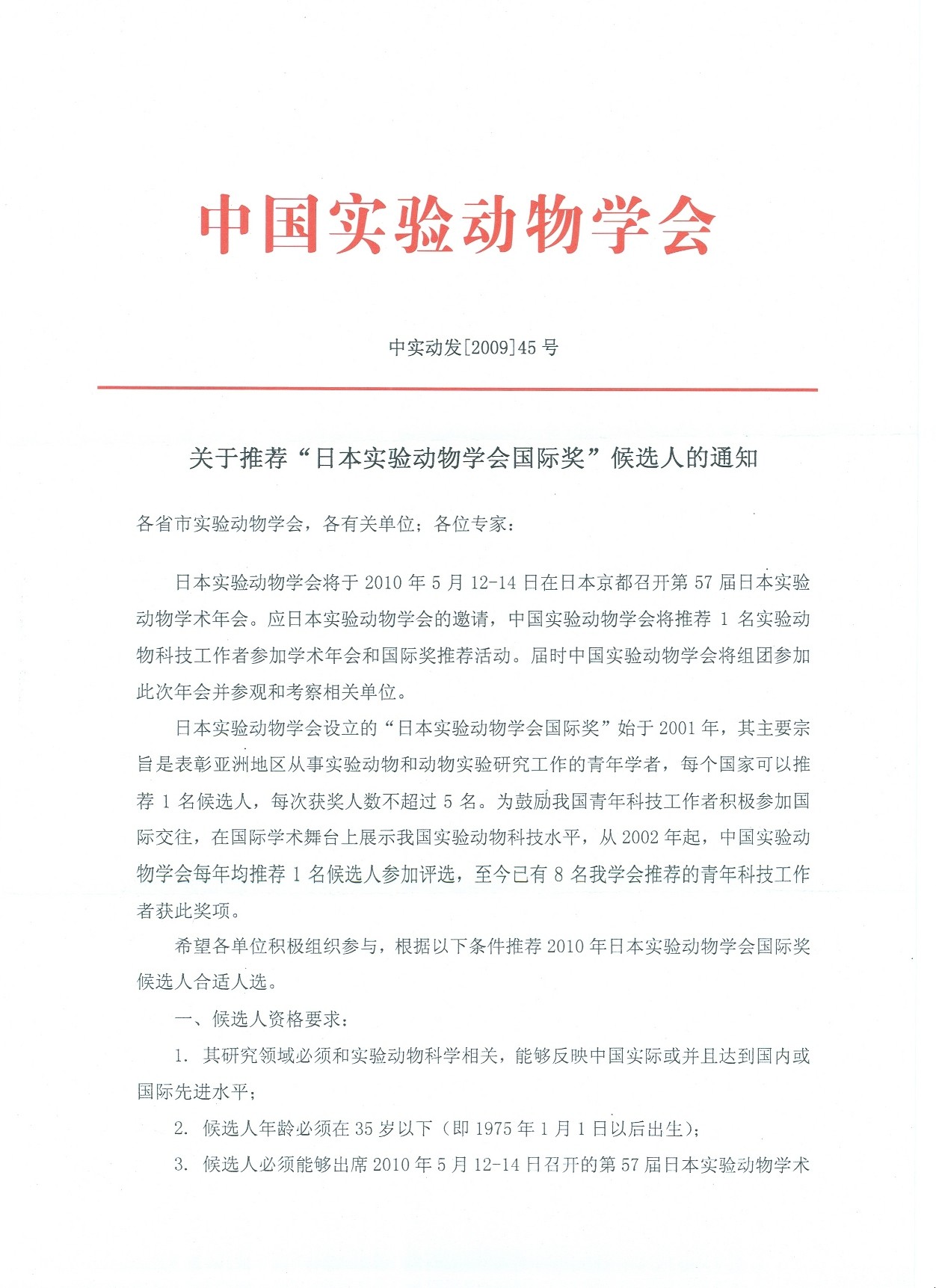 关于推荐“日本实验动物学会国际奖”候选人的通知