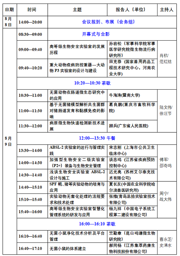 大会将聚焦“实验室生物安全设计建设及装备前沿,共创生物安全新质生产力”主题,采取大会论坛、主题论坛、现场交流、展览展示等形式,围绕我国现代生物技术中安全要求和体系建设前沿、全流程多角度展开深度研讨,寻找实验室建设的创新发展之路。同时会议期间,举行“无菌动物在生命科学研究中的应用太湖湾论坛”,就无菌动物体系建立、无菌动物的解剖学和生理学特征以及无菌动物在免疫学、营养代谢、肠道微生物组、宿主-微生物互作机制等方面应用与研究进行交流。热诚欢迎实验室建设与管理、生物安全、实验动物学、临床医学和动物医学实验室以及新药和疫苗研发、生产的专家、学者、研究人员、企业代表及研究生踊跃参会。现将有关事项通知如下: