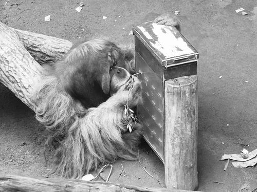 莱比锡动物园的猩猩在使用工具解决问题。图片来源:马克斯·普朗克人类学进化研究所